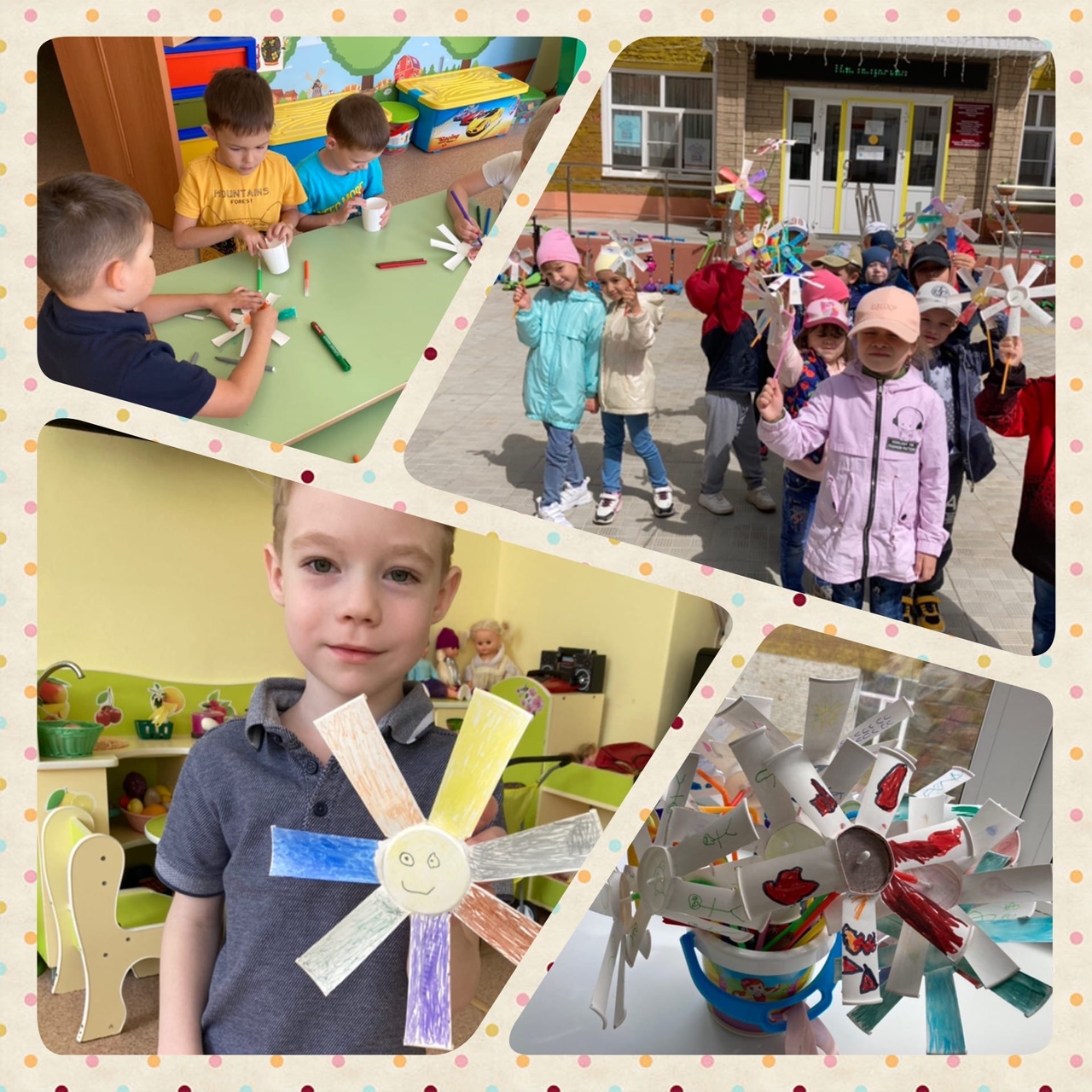 Для изготовления данной поделки мы использовали белые бумажные стаканчики, которые можно разукрасить по своему желанию, трубочки для коктейля, ватные палочки, вместо гвоздика. Наша вертушка готова! Можно ловить ветер! Своими поделками ребята не только поиграли сами, но и порадовали малышей!