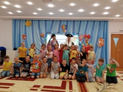 Хоть наши ребята еще не учатся в школе, но о таком празднике как «День Знаний» они все же знают. В музыкальном зале детей встретила Пеппи, она собиралась идти в школу, да вот только ее портфель оказался наполнен не школьными принадлежностями, а картами, с помощью которых ребята совершили интересный путь по станциям. На станции «Умники и умницы» их встречал ученый с различными заданиями, на станции «Эмоции» ждала ребят с веселыми играми Веселушка, а на станции «Спортивная» дети поиграли в подвижные игры. Каждый герой дал ребятам по школьной принадлежности для Пеппи, дети все передали ей и исполнив вместе веселый танец «Первоклашки» Пеппи попрощалась со всеми и ушла в школу.