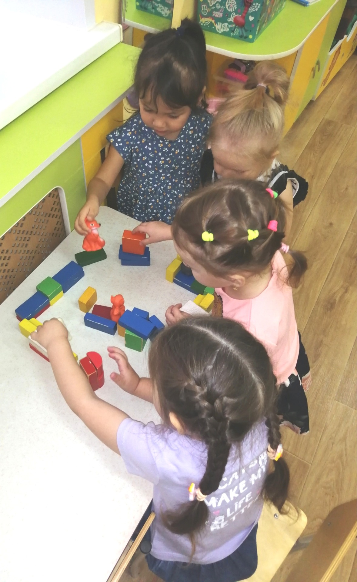 игрушки, рисовали домики , делали коллективную аппликацию "Наш