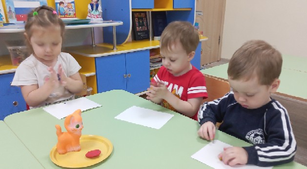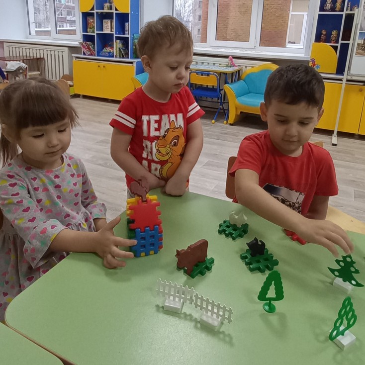 В творческой мастерской слепили мисочку для котёнка, сконструировали двор, для домашних животных и их детёнышей.