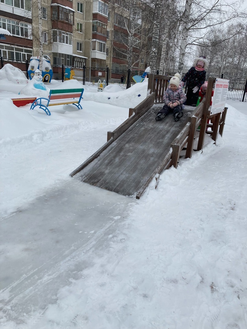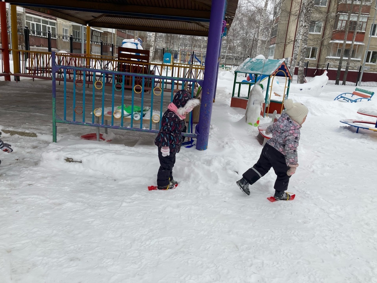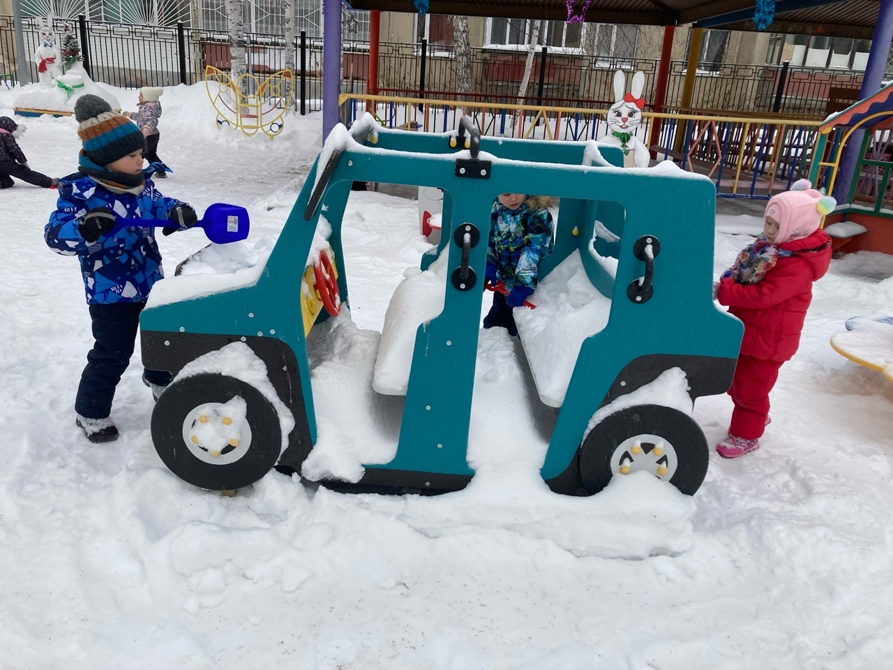 Они катаются на лыжах, строят снежные крепости, мчатся с горки на ледянках, бегают по лабиринту, играют в сюжетно - ролевые игры, помогают расчищать от снега машины.