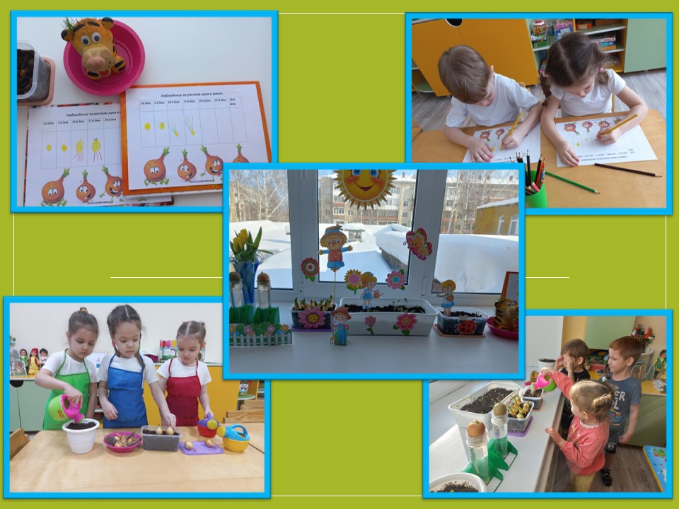 рассаду в клумбу на участке детского сада. Посадили лук в землю и в воду (решили поэкспериментировать), и посмотреть, где быстрее начнет
