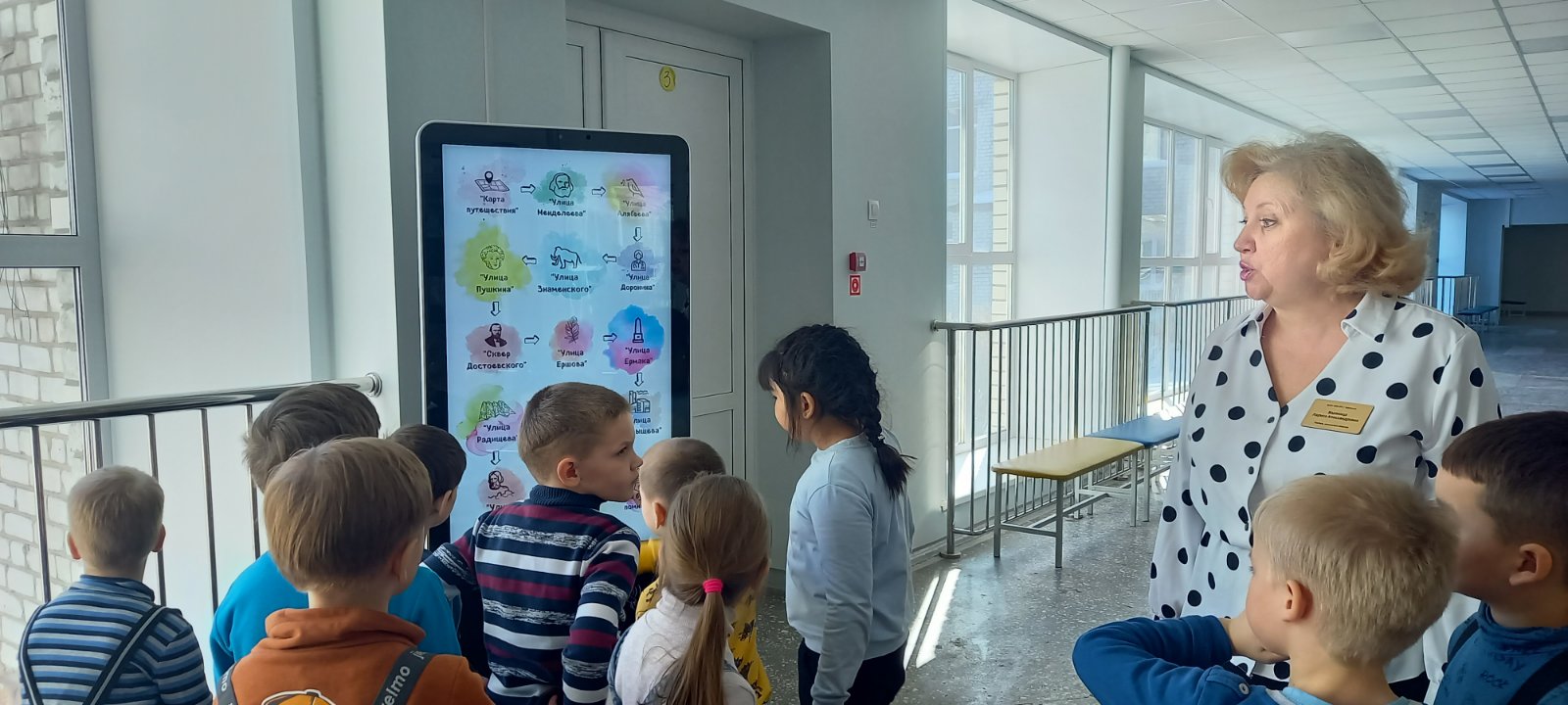 Детям показали учебный класс, где они смогли посидеть за партами, как настоящие школьники. Далее ребят познакомили с кабинетом робототехники, кабинетом труда для мальчиков и девочек.