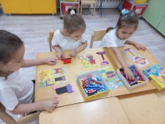 Дети с огромным интересом играли в математические игры : «Сравни и подбери», «Собери фигуру», «Разложи по цвету», собирали пазлы, логические игры «Часть и целое», а так же «Мои первые цифры», играли в