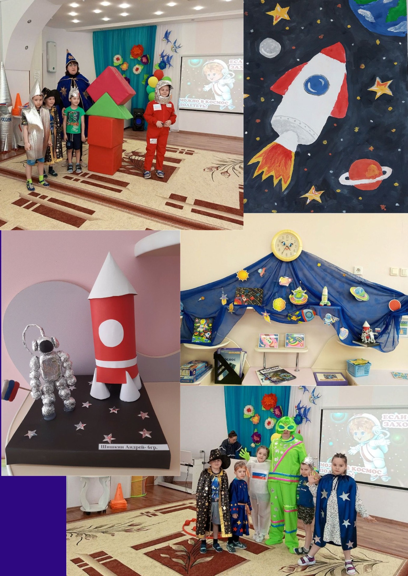 т. д. В сюжетно- ролевой игре ребята применяли полученные знания. В создании выставки работ по теме приняли участие дети и родители. Для праздника детей «Путешествие в космос» каждый родитель приготовил оригинальный, необычный потрясающий костюм. А на празднике ребят ждали интересные игры, конкурсы и встречи.