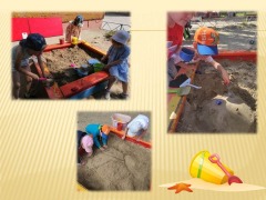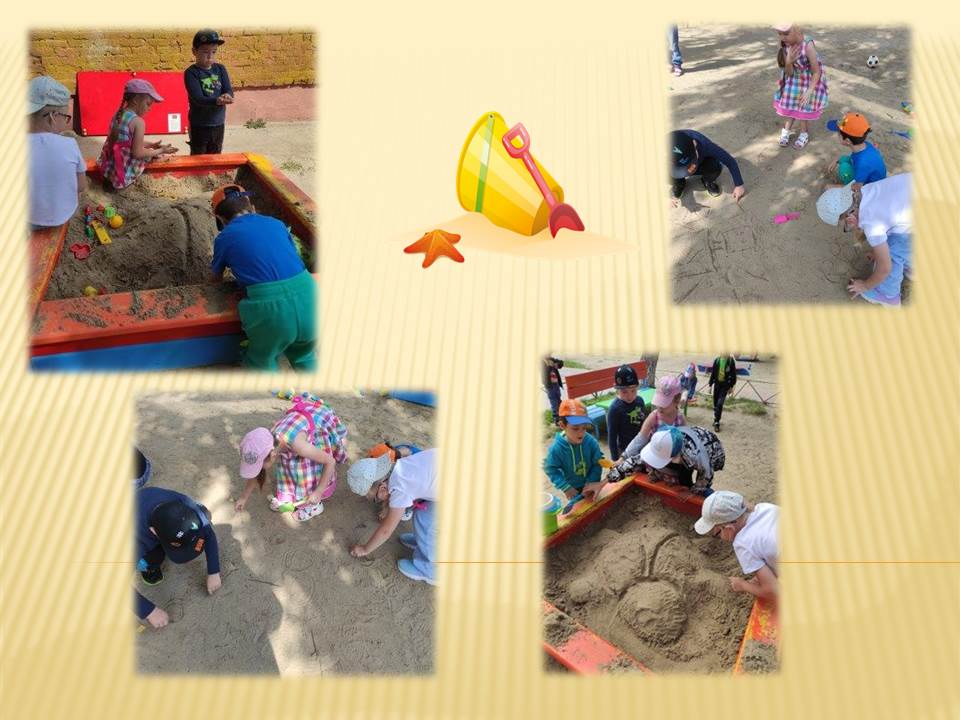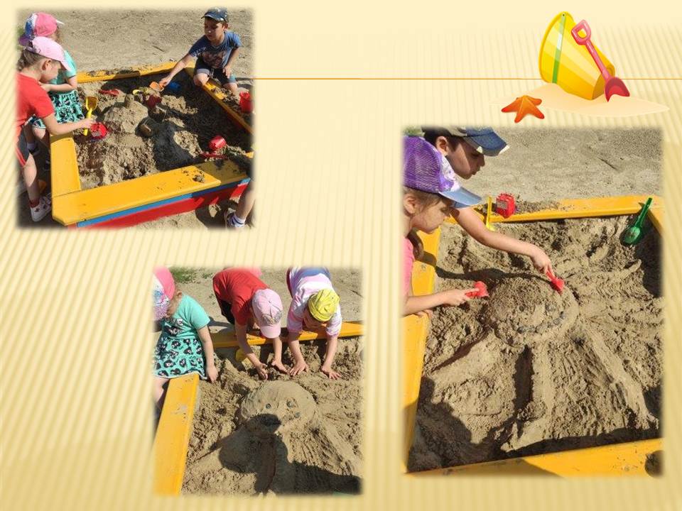 Играя с песком, дети получают огромный закаливающий и оздоровительный эффект, а так же развивают мелкую моторику, умелость, воображение и усидчивость. Для игр в песочнице дети используют совки, разнообразные формочки, грабельки, палочки, чтобы украсить свои песочные фигуры мы предлагаем детям различные: пробки, шишки, шарики, камешки, крышечки. Ребята каждый день на прогулке, из песка сооружают различные постройки, замки, морских обитателей, готовят куличи, торты, рисуют палочками на песке, делают печатки из формочек. Игры с песком вызывают у ребёнка чувство комфорта, удовольствия, радости, что благоприятно сказывается на работе всех функций и систем организма.