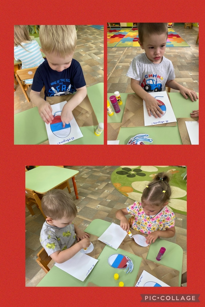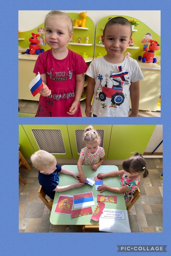 В ходе познавательной беседы, ребята узнали из каких цветов состоит наш флаг, какой формы и что обозначает каждый из этих цветов. Играя в настольные игры, ребята узнали в какой последовательности расположены полосы на флаге. Ребята закрепили свои знания о флаге РФ, изготовив аппликацию «Флаг России».