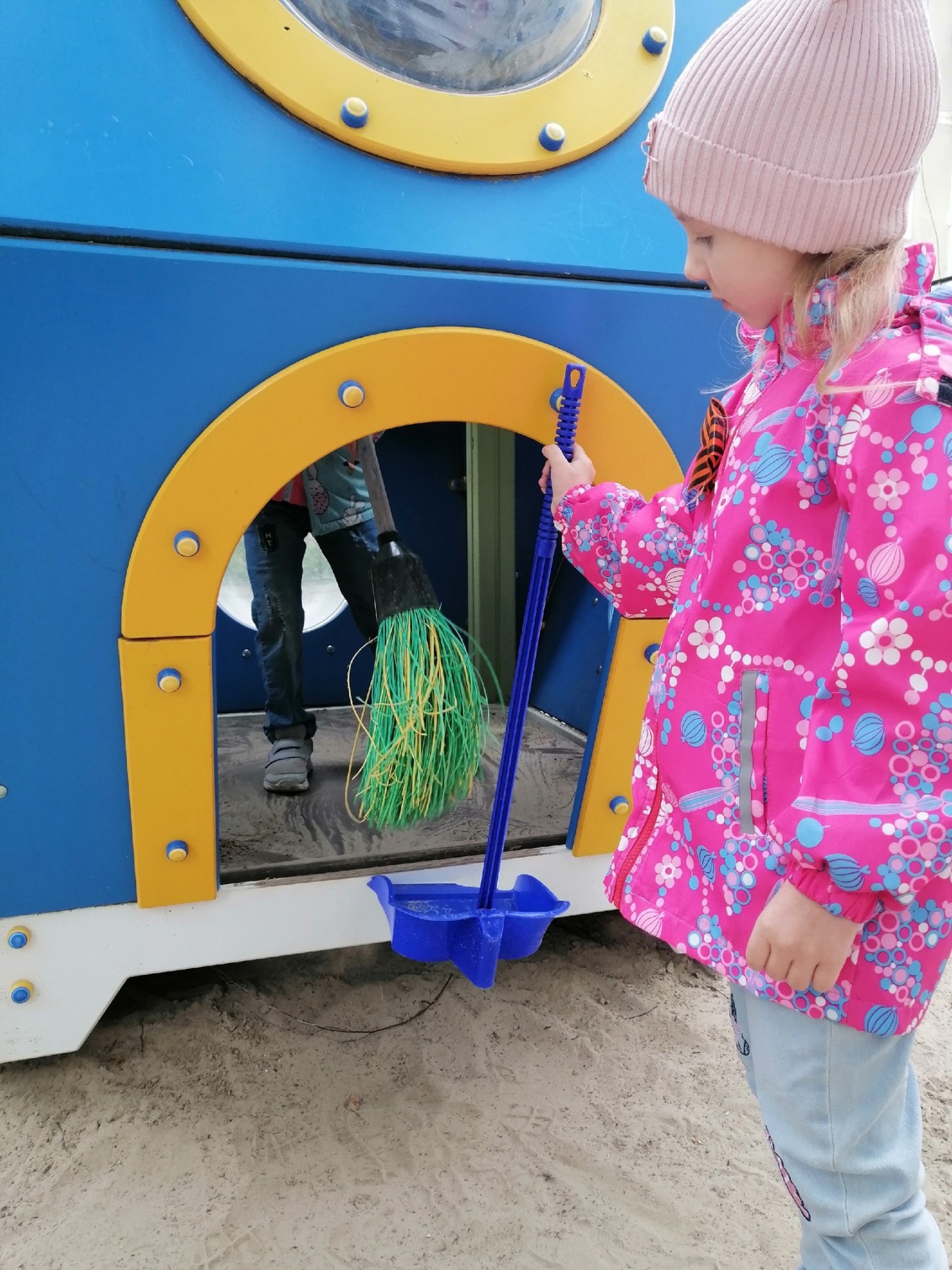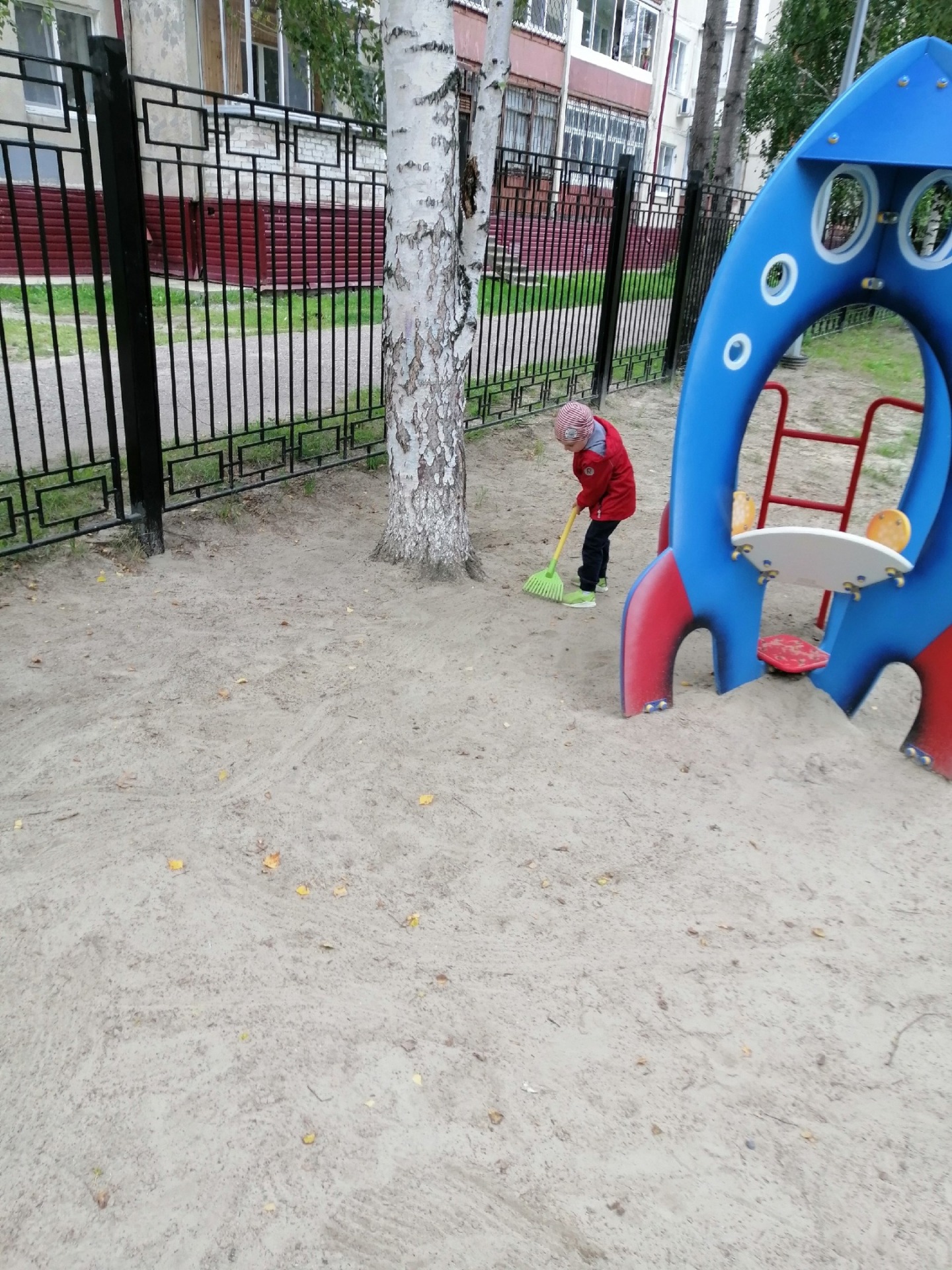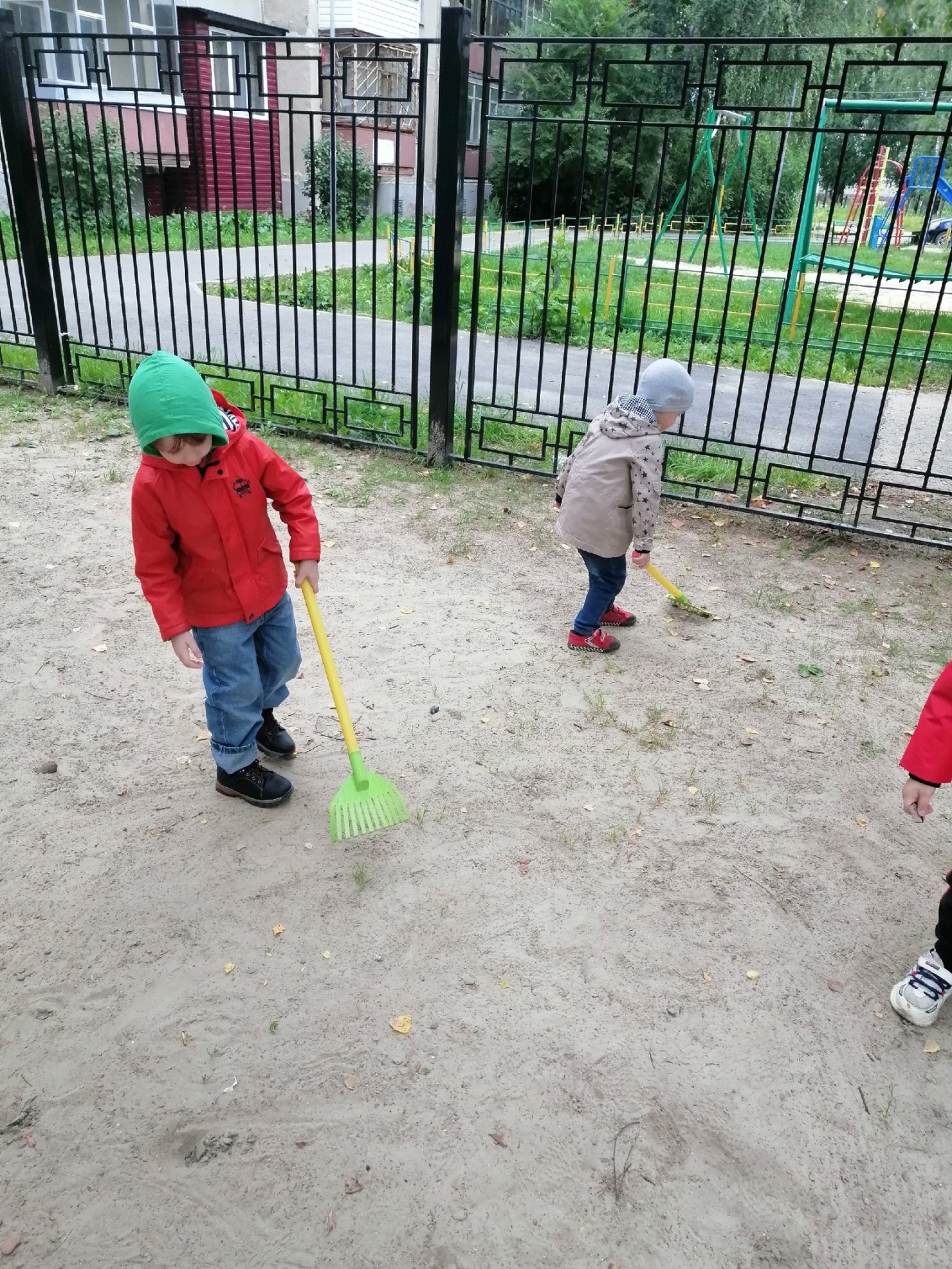 Сегодня мы с ребятами подметали дорожки, сметали песок с построек.