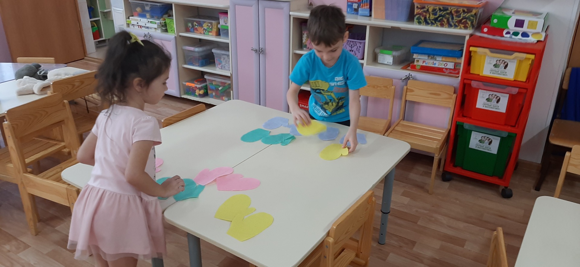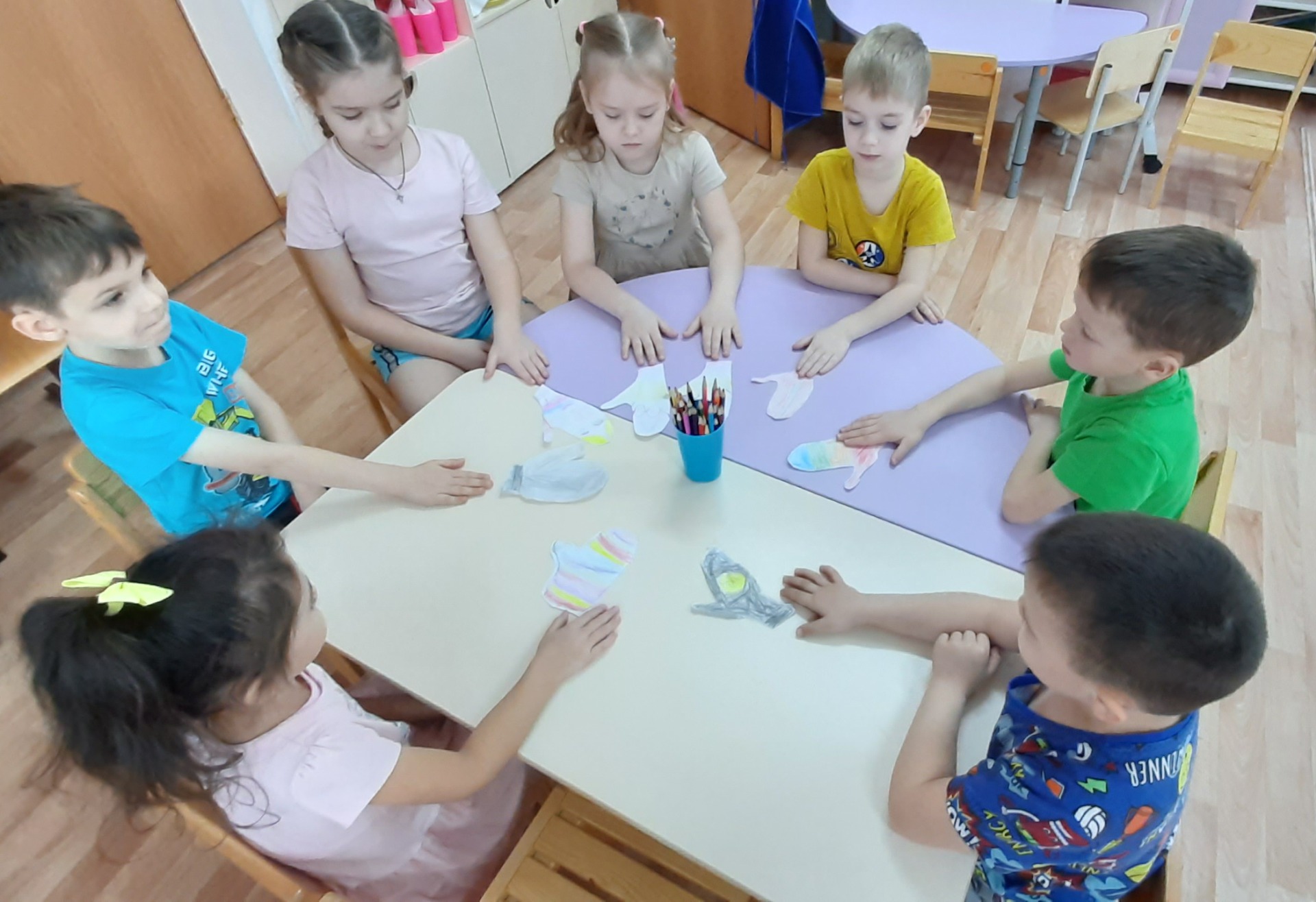 Вот и мы с детьми в подготовительной группы рассматривали какие у кого варежки, из чего связанны, сшиты, сделали подарок другу « Красочную варежку»,поиграли в игру «Найди пару». Проведя эксперименты со снегом и льдом, узнали их свойства.