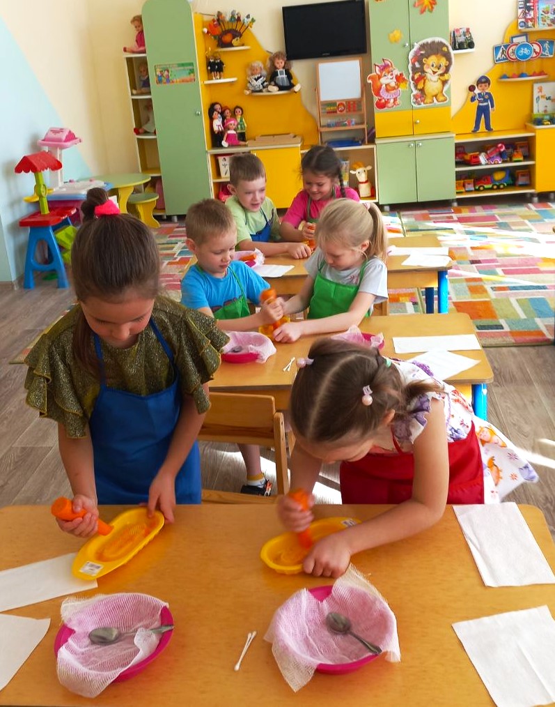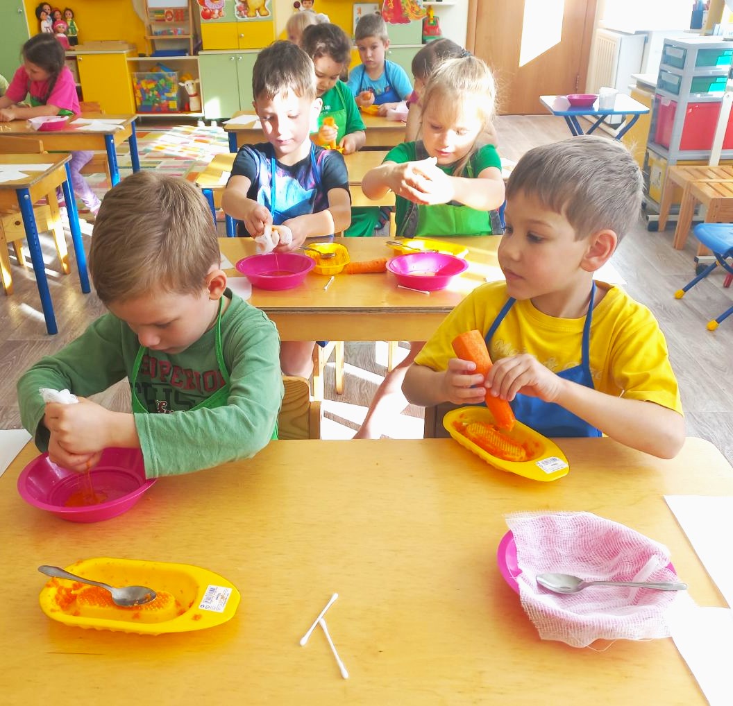 В первой части эксперимента наши маленькие исследователи с большим интересом натерли свежую морковку на терке. Ребята были в восторге от яркого цвета и приятного аромата! Мы поговорили о том, сколько полезных витаминов содержит морковь и как она помогает нашему организму.