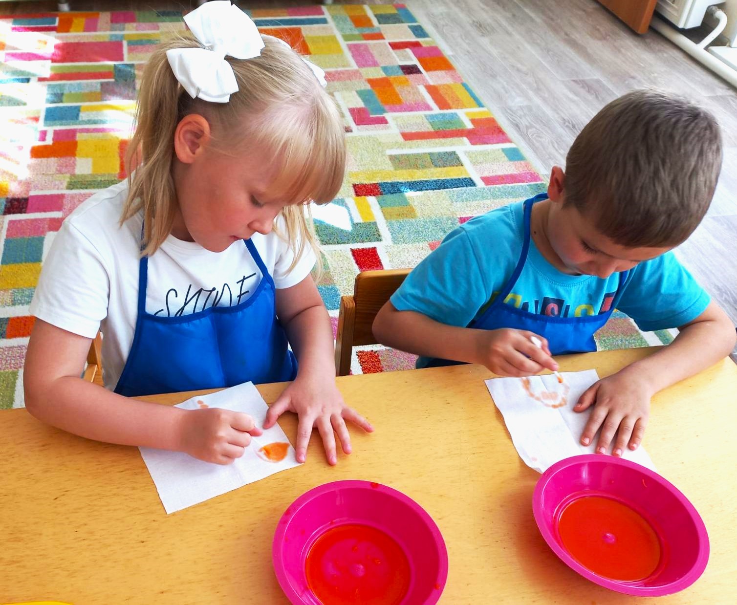 Но на этом наши эксперименты не закончились. Используя полученный сок, дети решили создать свои шедевры! Они набирали немного морковного сока на ватную палочку и рисовали узоры на салфетках. Каждый ребенок проявил свою фантазию: кто-то рисовал яркие цветы, дома, кто-то забавные узоры. Эти «морковные картины» получились очень красивыми и оригинальными!