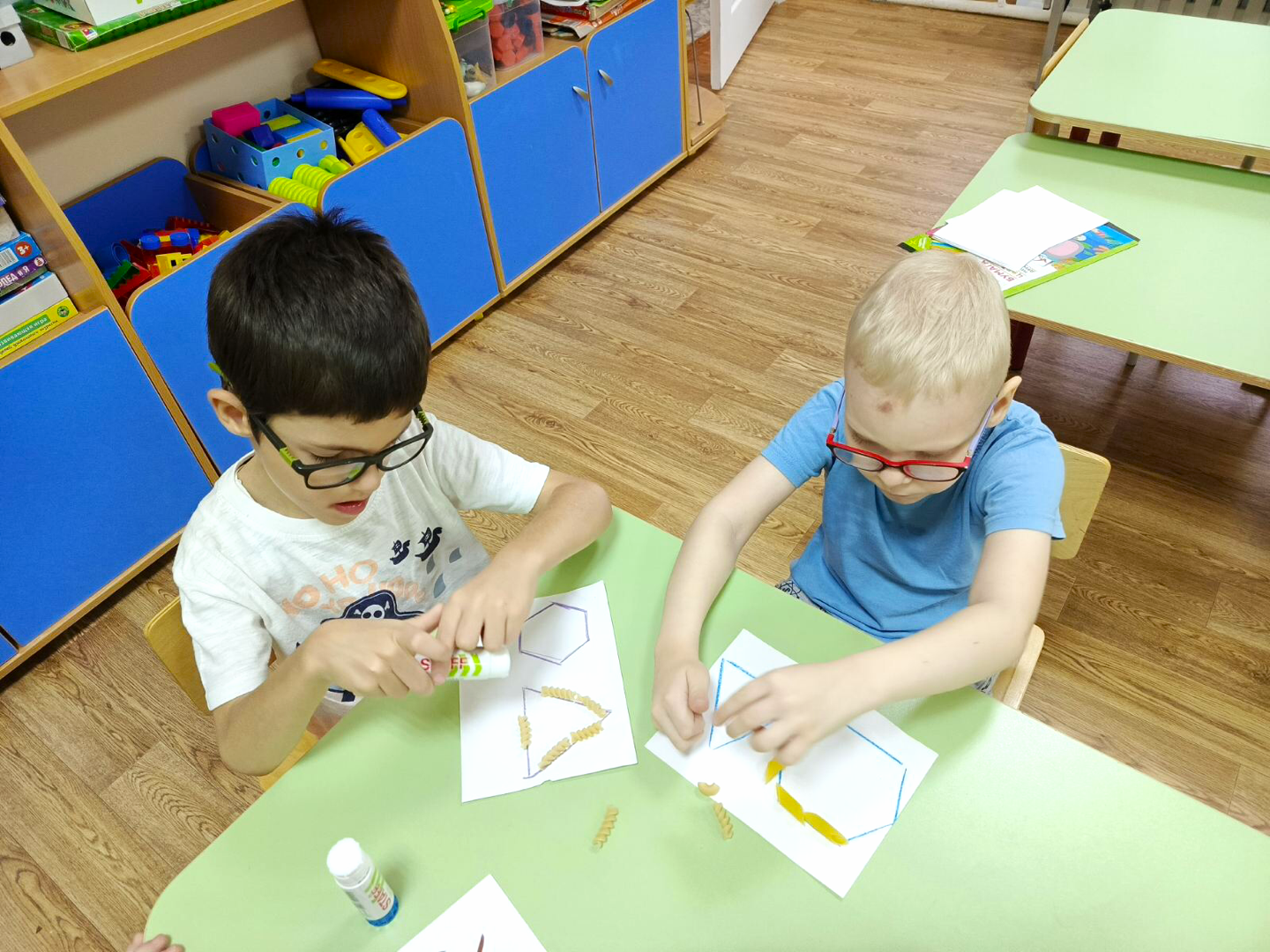 Ребята с удовольствием лепили с использованием макарон, делали аппликации "Осеннее дерево", "Геометрические фигуры", выкладывали из макарон "Лучики для солнышка".