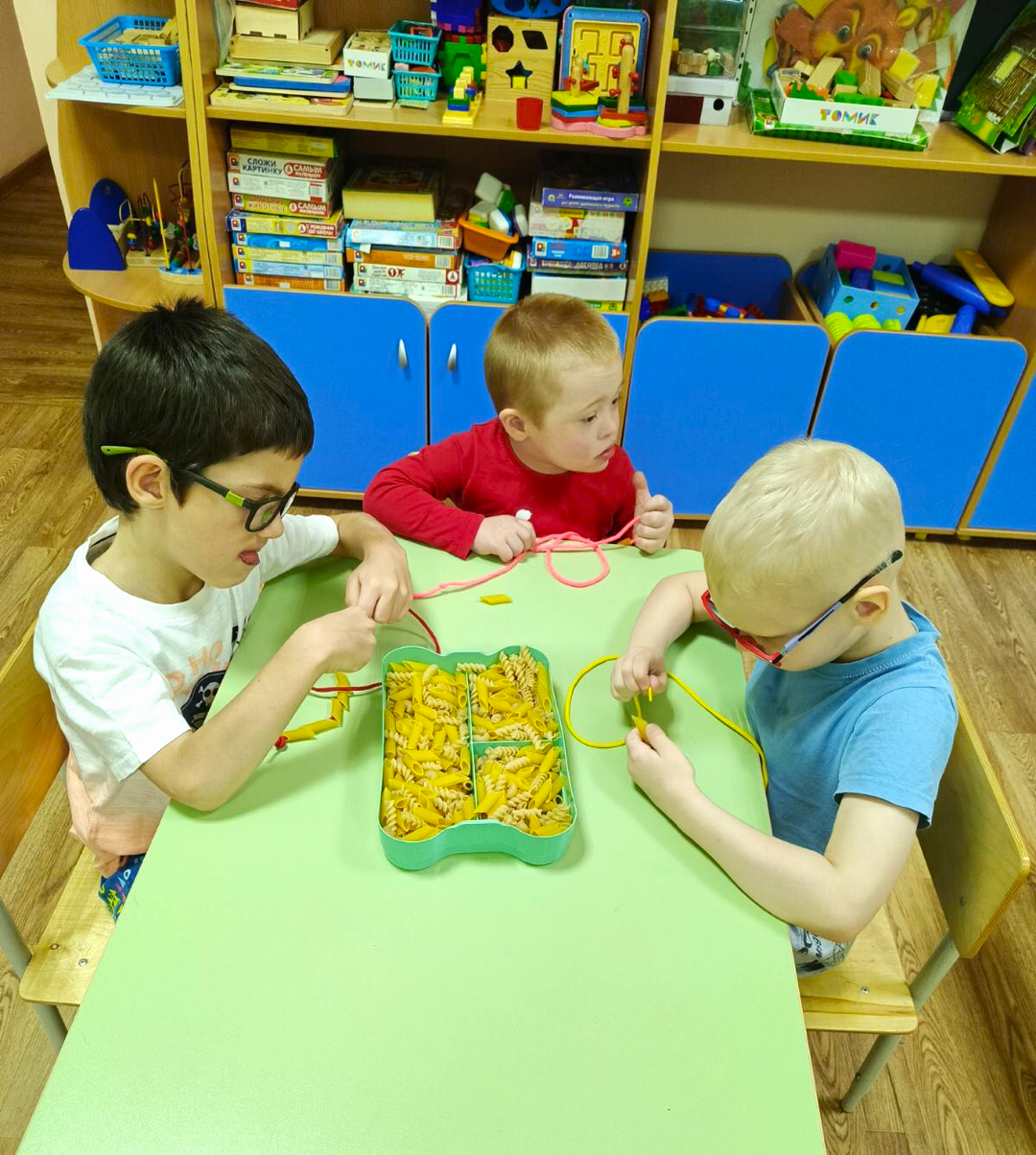 С большим интересом дети нанизывали макароны на шнуровки, в результате чего у них получились необычные бусы.
