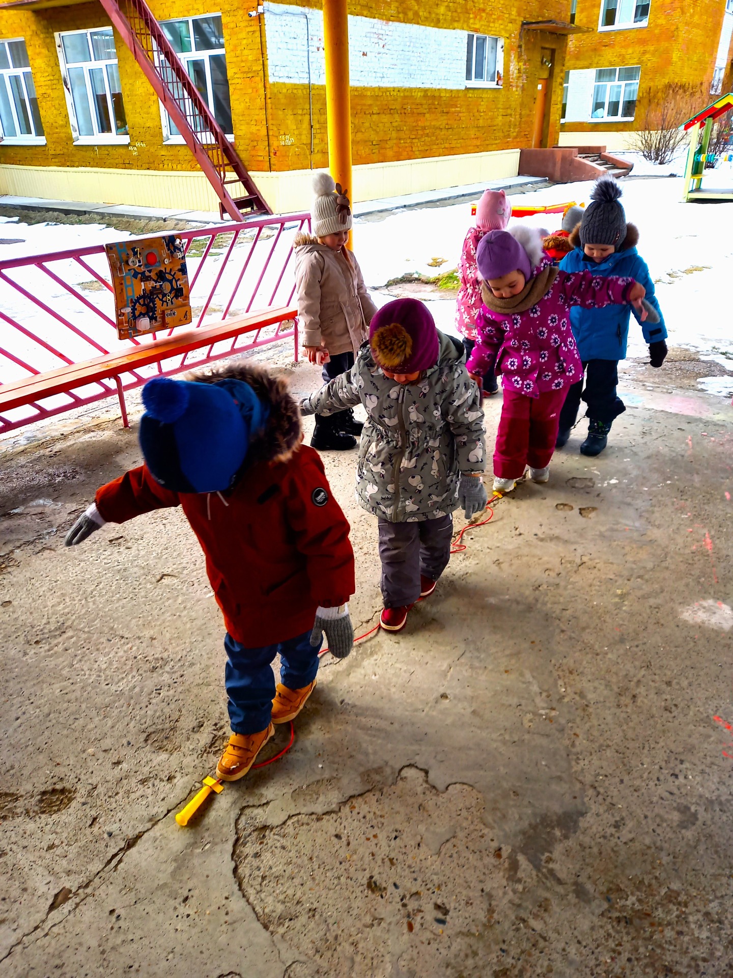 Затем малыши превращались в "канатоходцев"- и шли над "ущельем" по скакалке, стараясь сохранять равновесие.