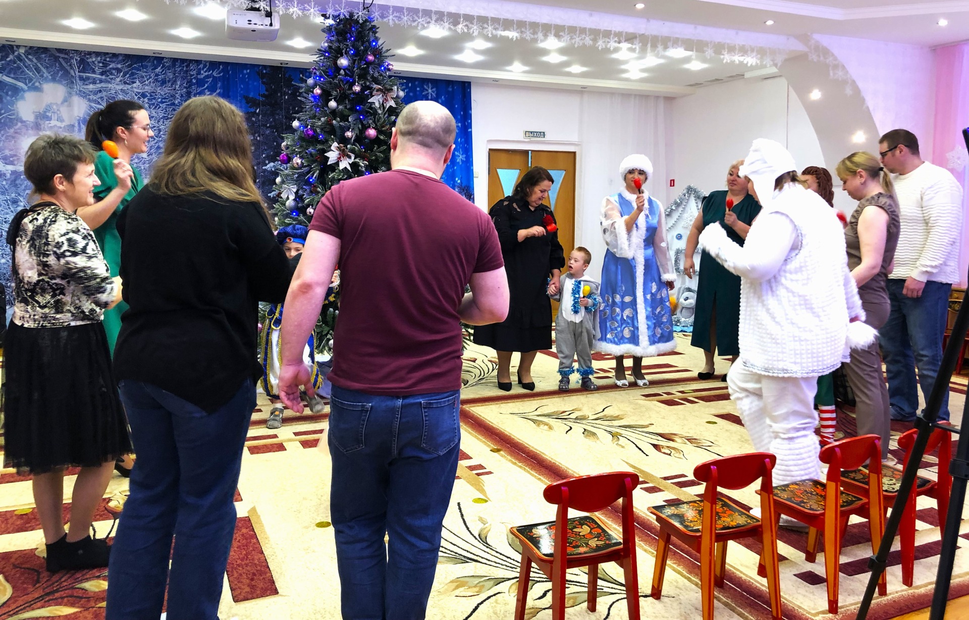 Ребята и их родители с удовольствием исполняли песни и танцы, все были нарядно одеты в новогодние костюмы, что добавляло празднику красок.