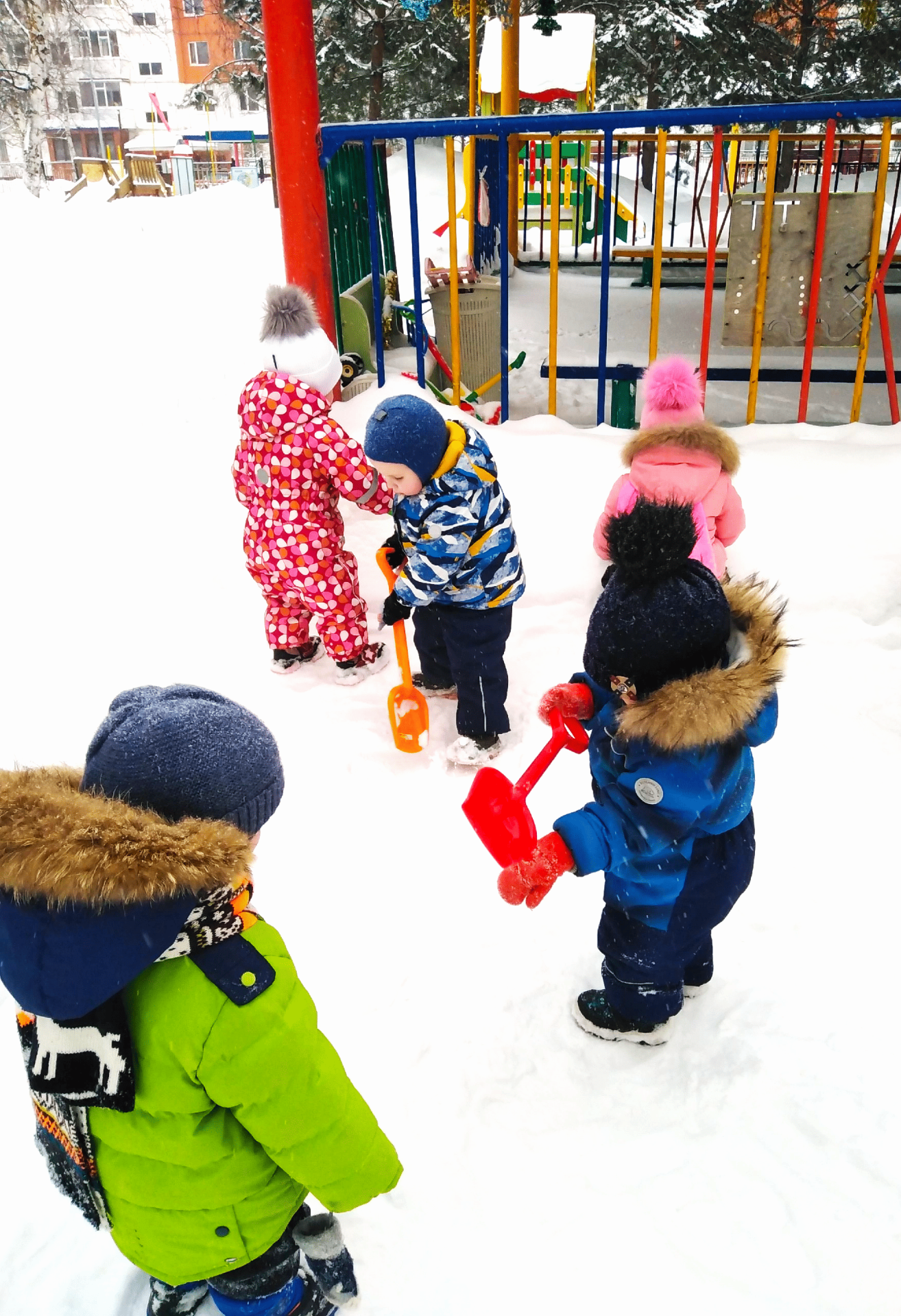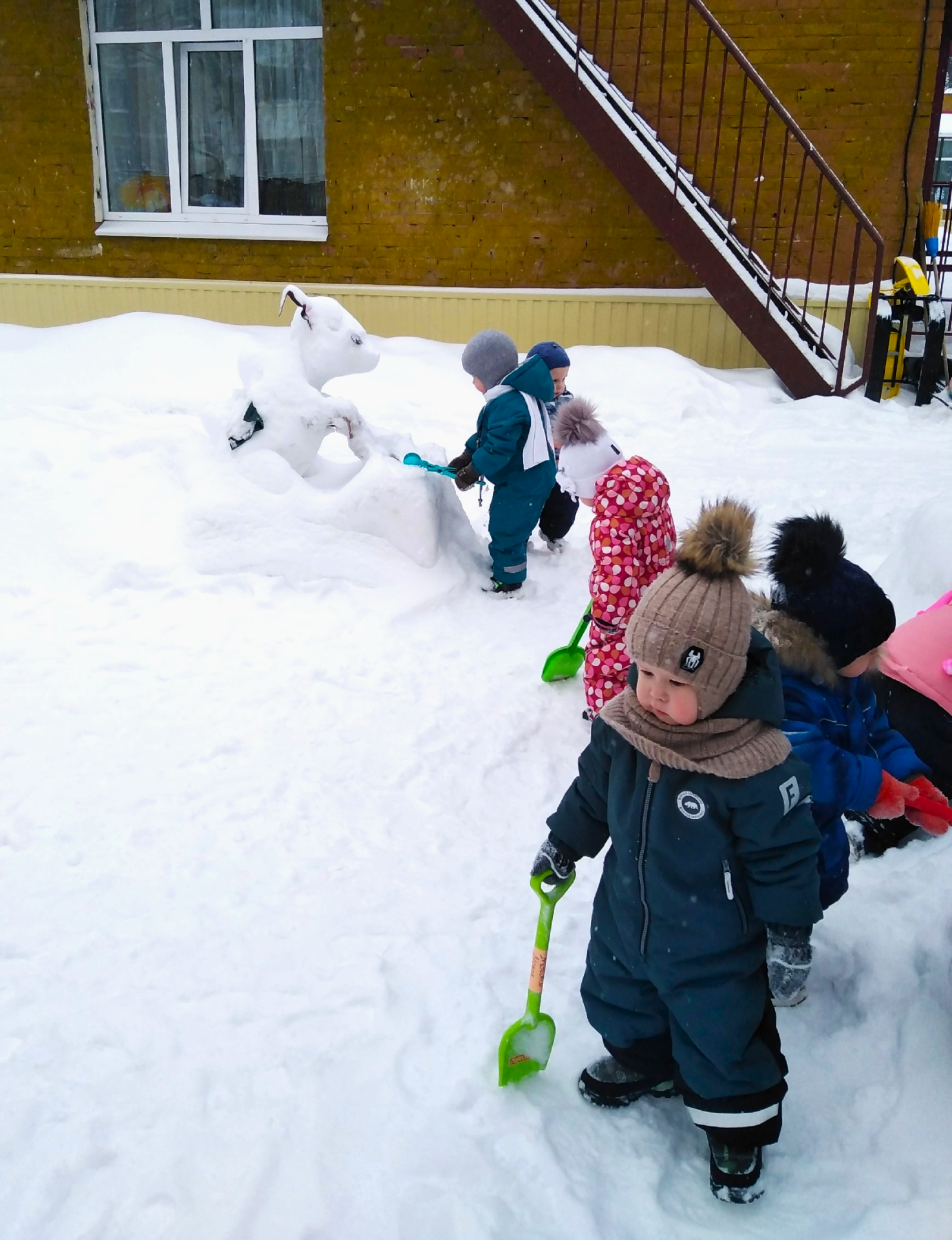 Наши ребята еще совсем маленькие, но тоже старательно помогали своим воспитателям в уборке снега.