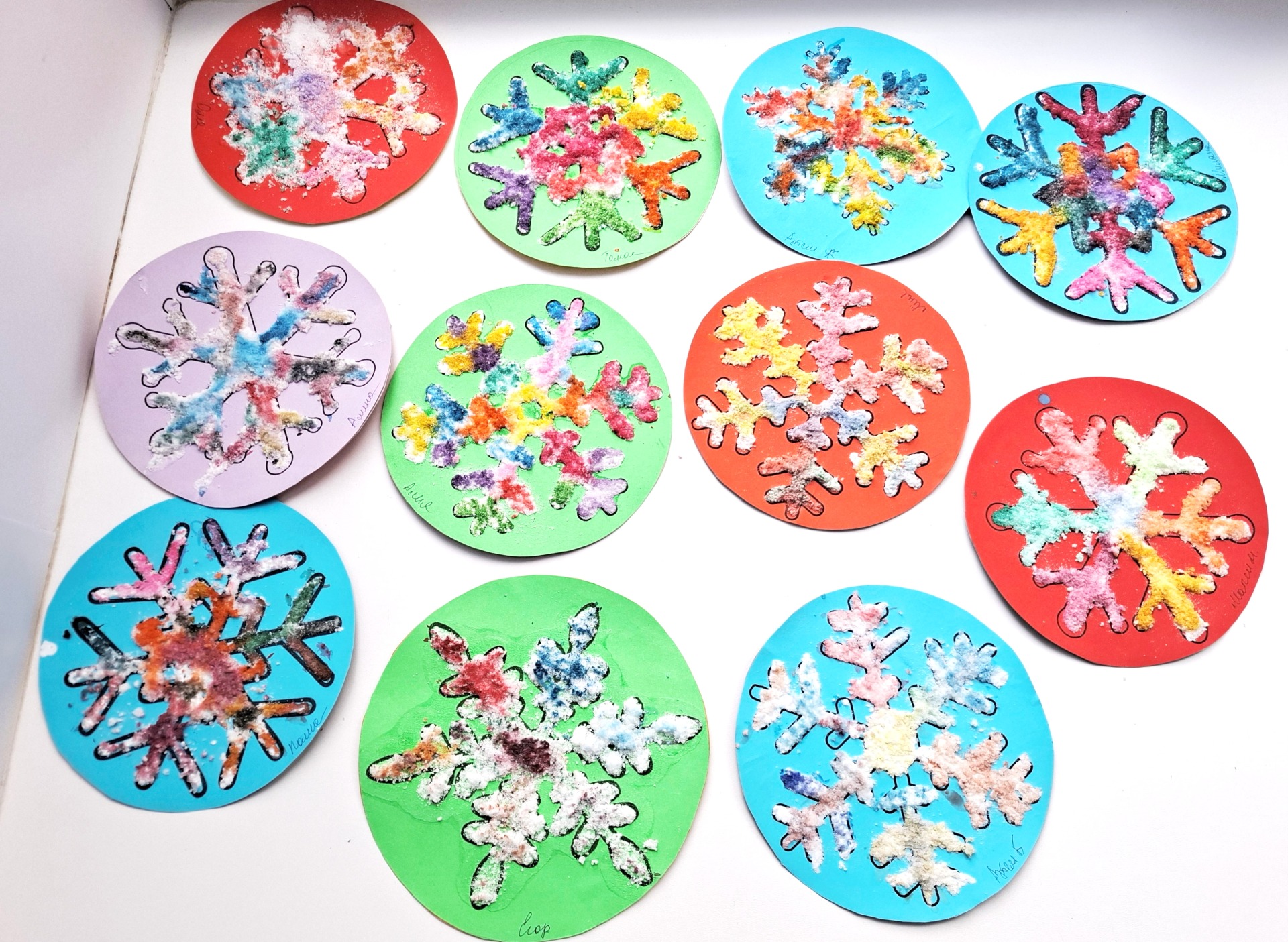Вторая часть нашего экспериментирования была посвящена творчеству. Дети использовали клей, для того, чтобы наносить соль на картон, добавив немного красок, получили удивительные снежинки, очень интересные на ощупь.