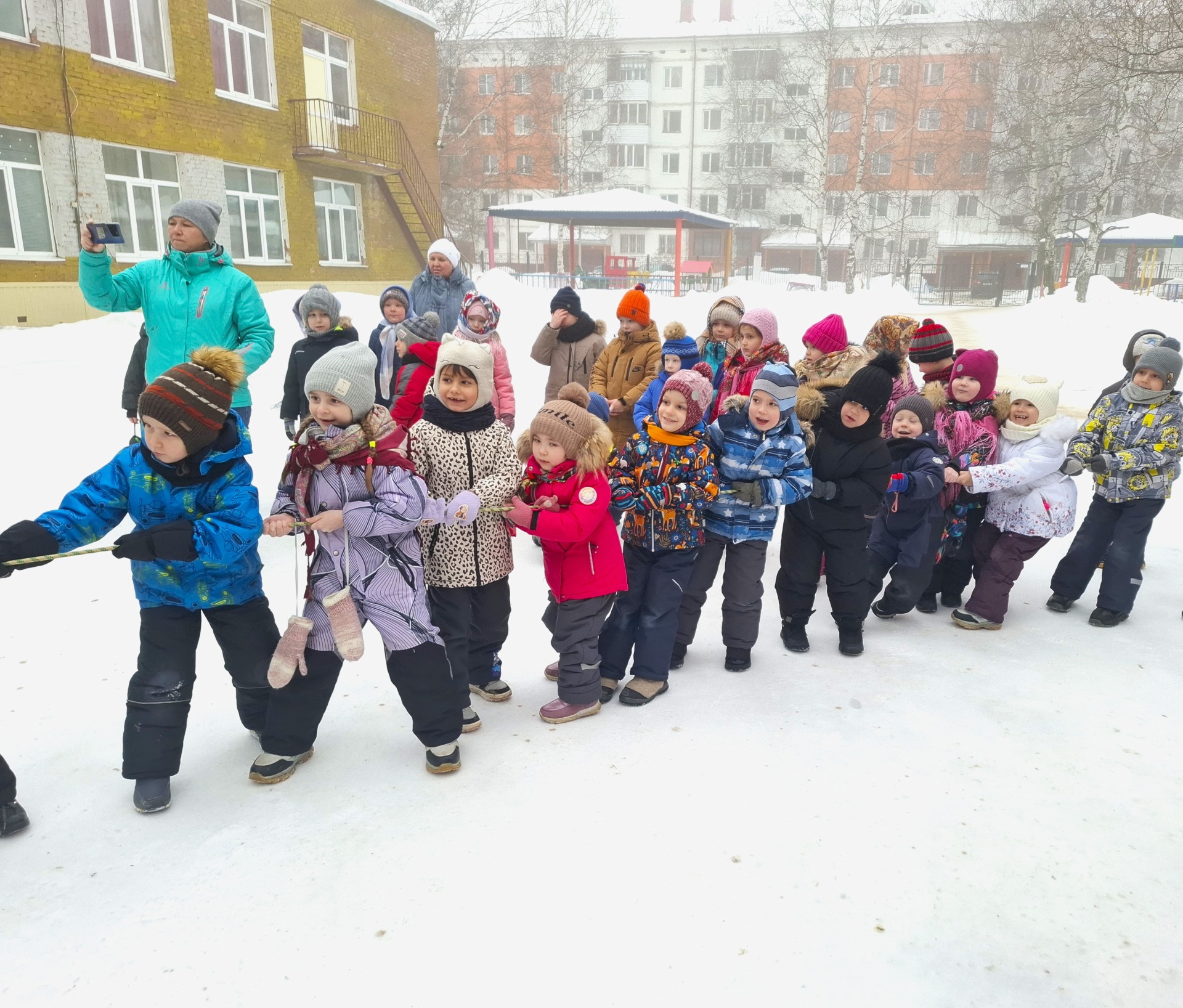 На прогулке детей ждали весёлые спортивные игры и конкурсы, которые позволили активно двигаться и наслаждаться свежим воздухом. Ребята перетягивали канат, бегали на лыжах, бросали снежки в цель. Каждый смог проявить свой талант и зарядиться энергией.