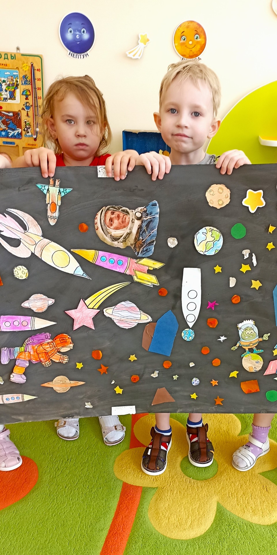 В нашем детском саду прошла тематическая неделя, посвящённая космосу. Целью данной тематической недели было развитие интереса детей к космосу и людям, покорившим его просторы, умение применять полученные знания в разных видах детской деятельности. Ребята рассматривали иллюстрации, картинки, фотографии с изображением звёзд и планет, отгадывали загадки. Узнали, кто такие космонавты и на чём они летают в космос. Полученные знания дети отразили в продуктивной деятельности. Дошкольное детство – важнейший период становления личности, такие мероприятия способствуют развитию патриотических чувств. Тема космоса очень притягательна для детей, ведь космос — это красота, таинственность, новые знания и простор фантазии.
