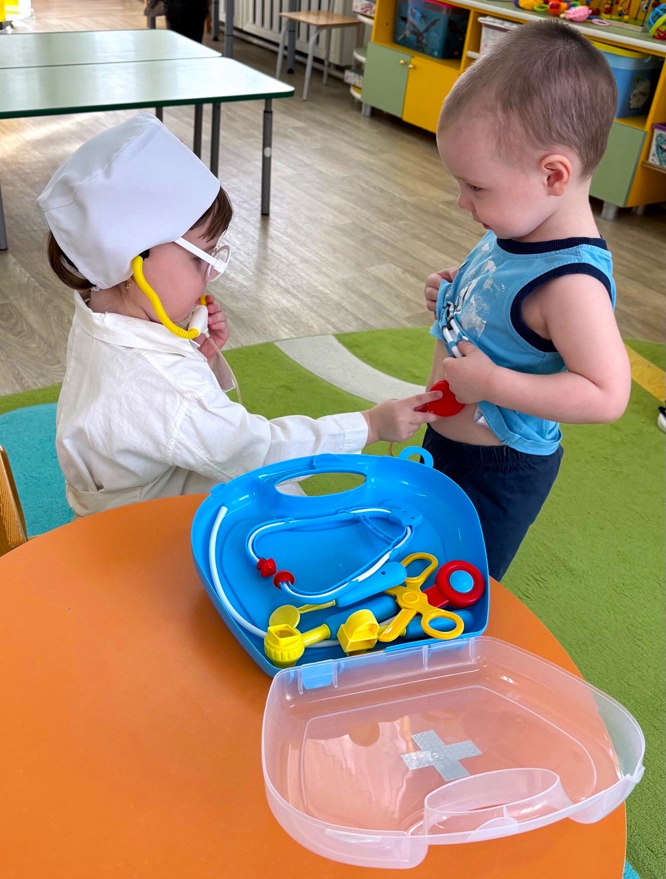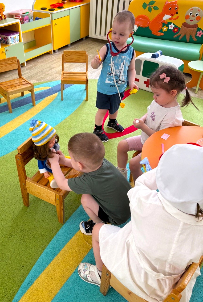 В ходе сюжетной игры была организована мини-станция скорой помощи, где дети могли попробовать на себе различные роли: врач, пациент. Малыши использовали игрушечные медицинские инструменты, стетоскоп и наборы для оказания первой помощи.