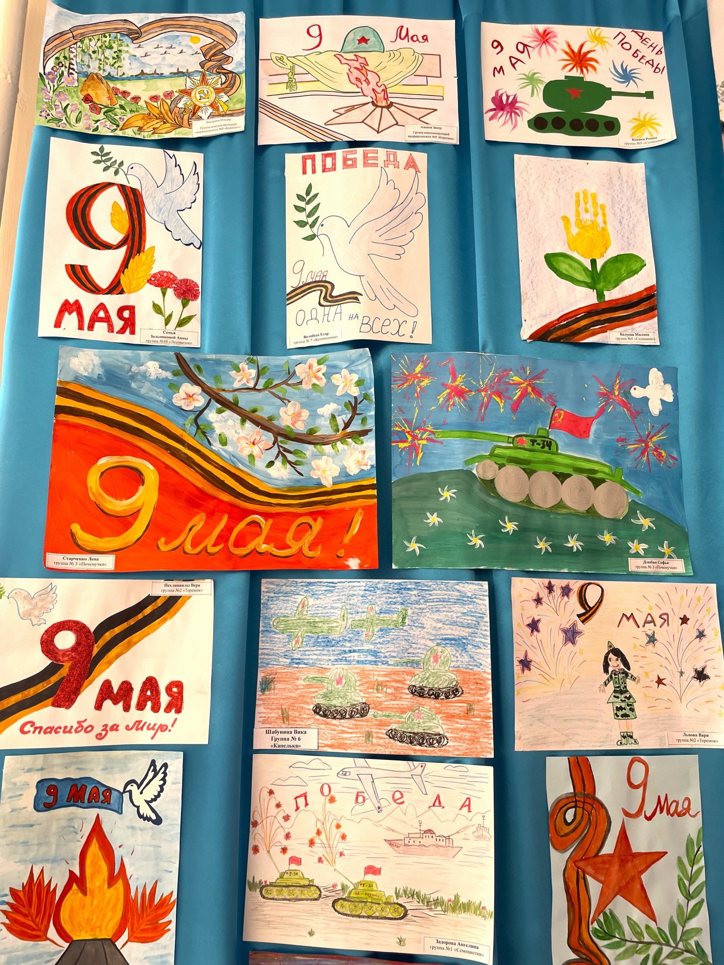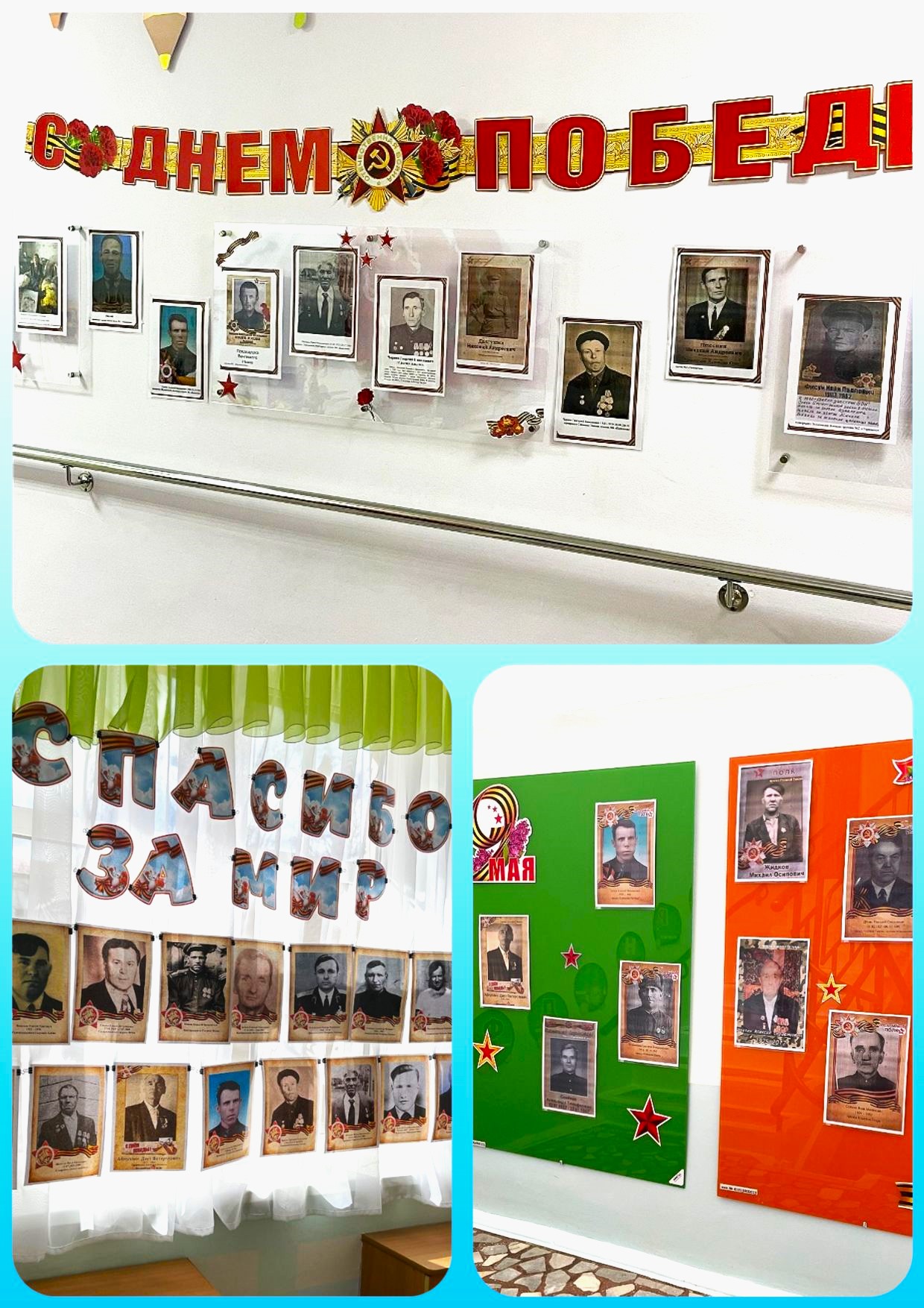 3. Для создания праздничного настроения оформили стенды «День победы», «Спасибо за мир» где были представлены портреты прадедов участников ВОВ.