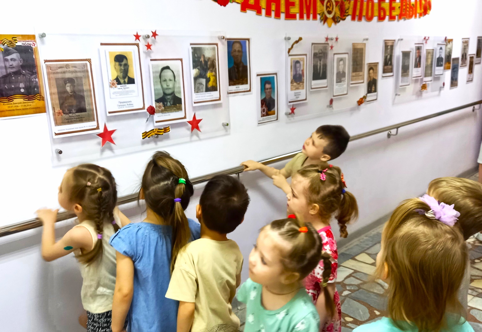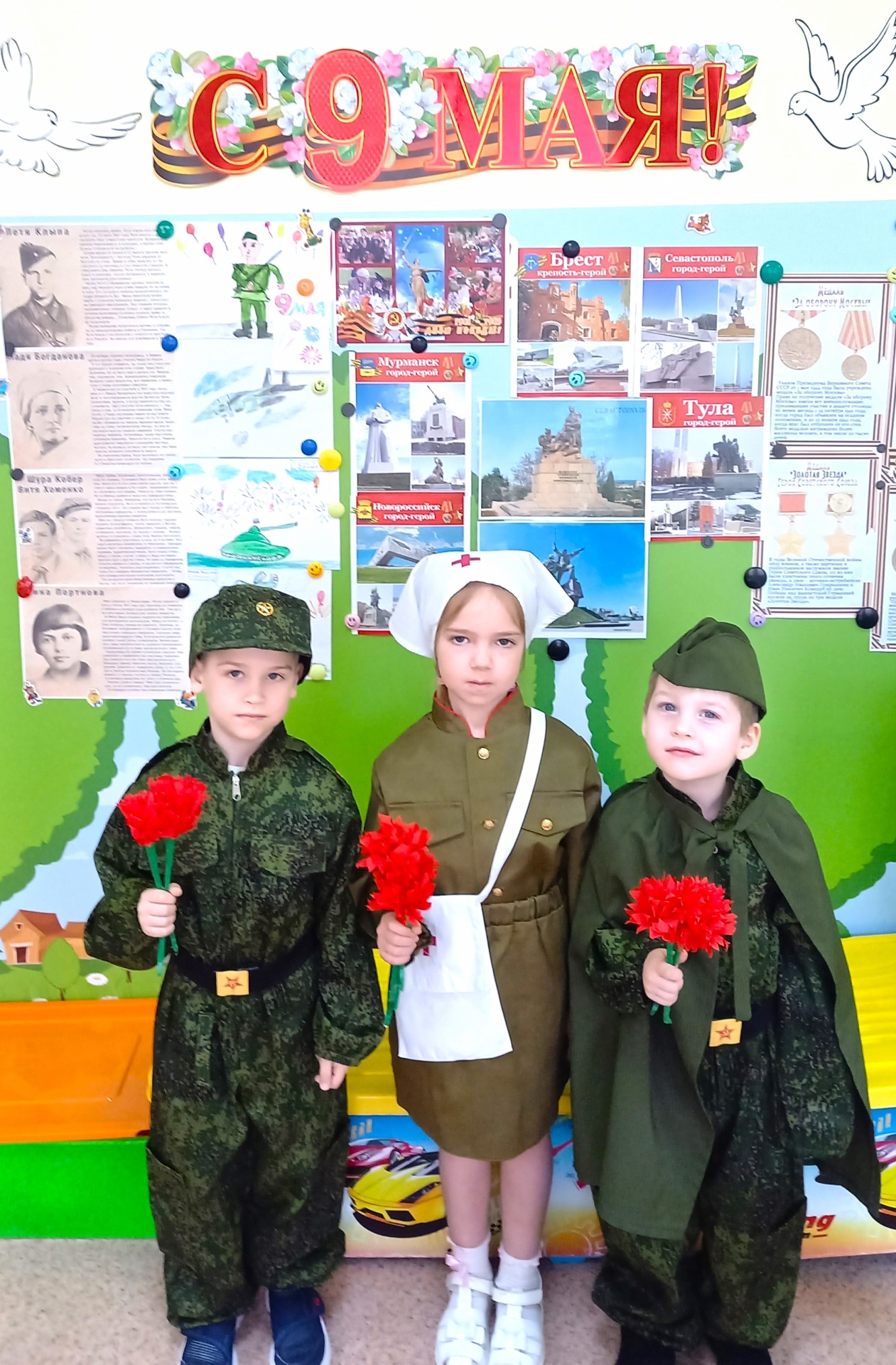 Посетили выставки, которые организованы с помощью родителей и педагогов детского сада, а также создали свою выставку в группе. Разучивали военные песни и танцевали под их звучание, использовали в танцах птицу мира - голубя, и рассказали, как они помогали нашим солдатам во время войны. Рассмотрели военную форму и фотографировались у фотозон посвящённых празднику.