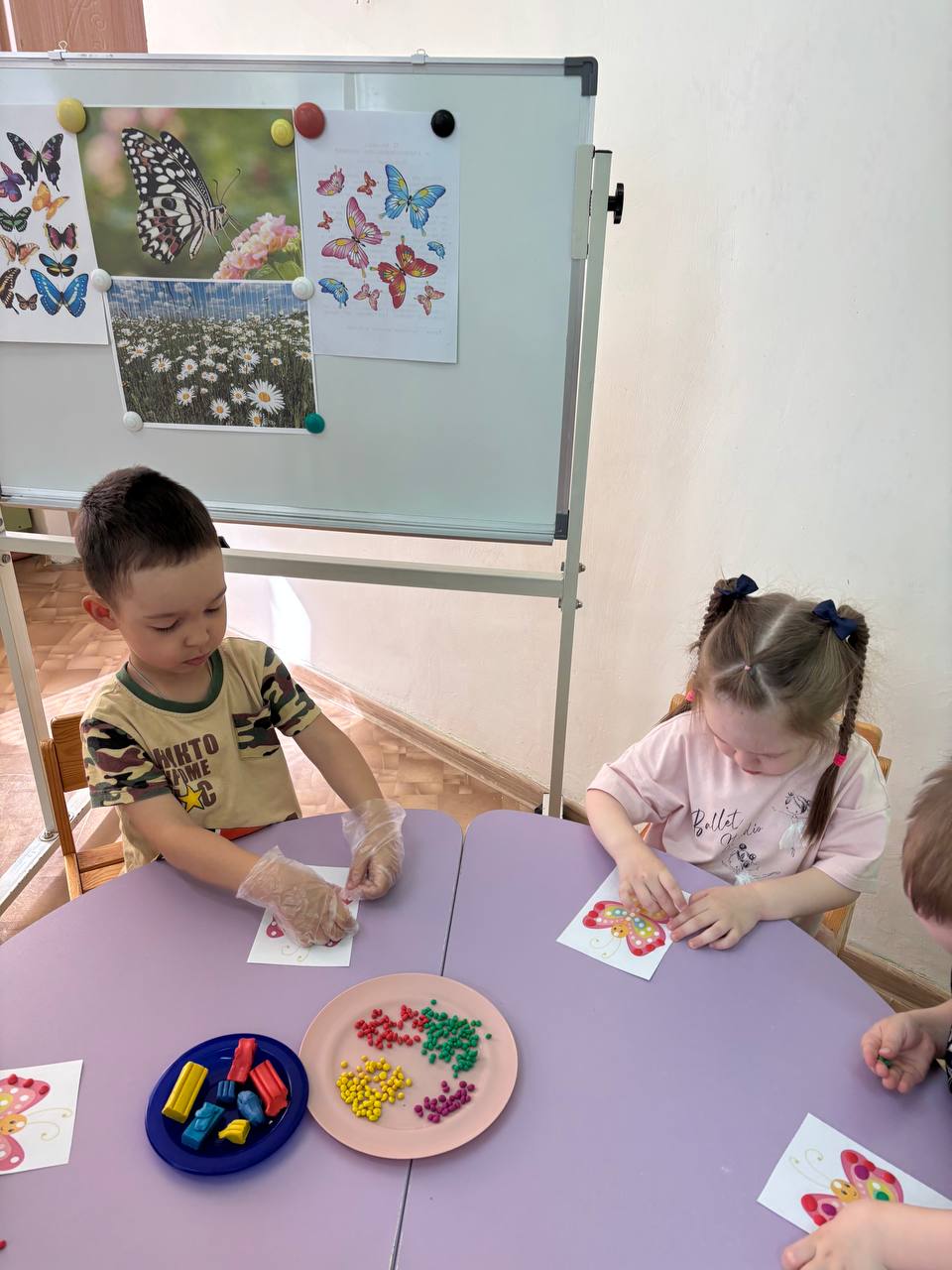 Лето удивительная пора в природе, когда красоту можно увидеть на каждом шагу. Нужно только не упустить эти замечательные моменты и показать их детям. Красота и грация бабочек завораживает каждого. Наверное, именно для этого она и создана - постоянно удивлять и вызывать восхищение. Вот и мы во второй младшей группе познакомились с чудесными существами на планете - бабочками. Рассматривали картинки и иллюстрации, узнали, что бабочки живут на лугах, в садах, и очень любят цветы, потому что пьют нектар- сладкий сок внутри цветка. Они привлекают их своим ароматом и яркими красками. Прочитали стихотворение Людмилы Мелеховой «Малютки бабочки». Играли в подвижную игру «Бабочки и цветы» В завершении украсили бабочку в технике пластилинография, мелкими шариками пластилина разного цвета.