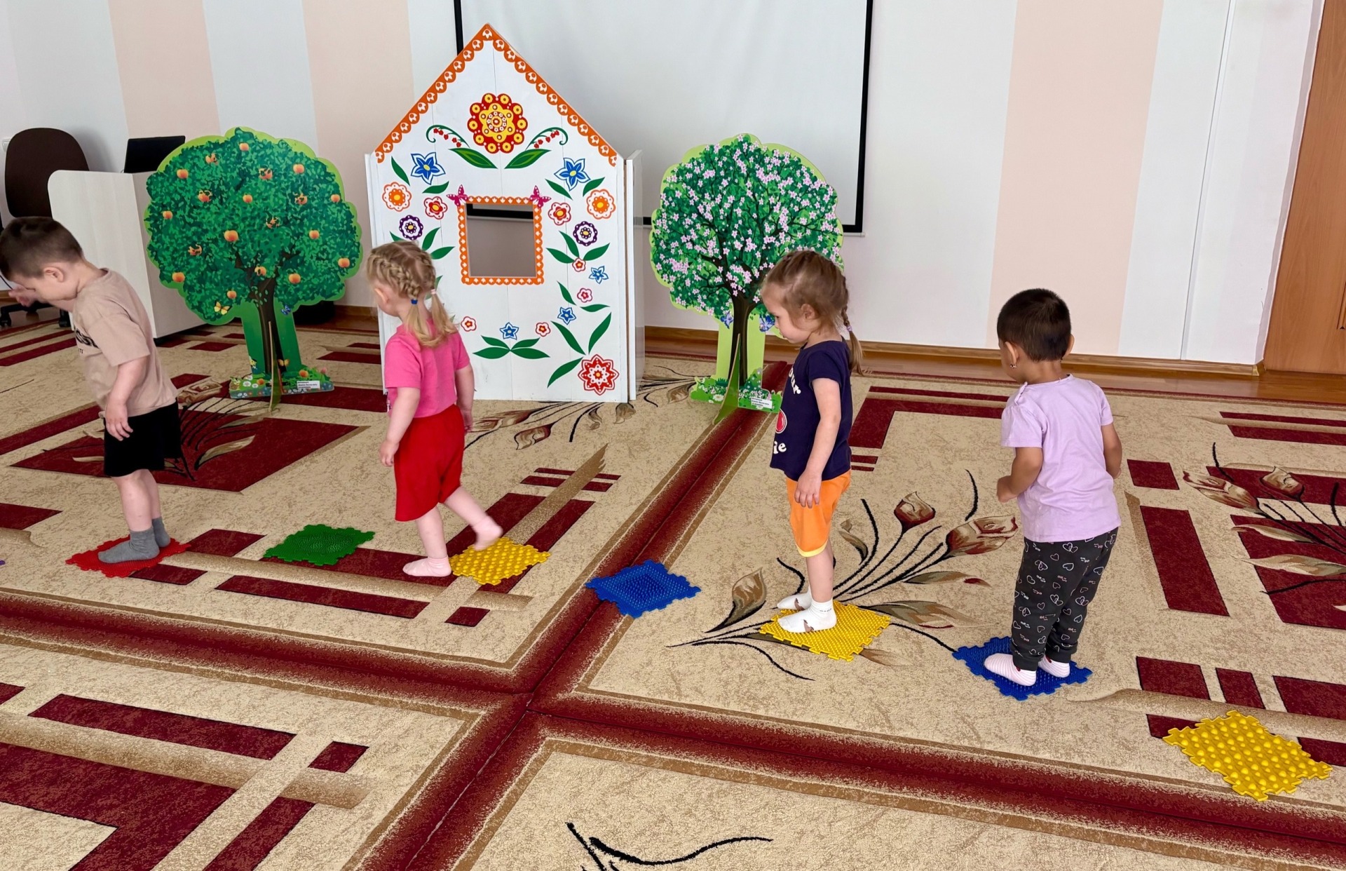 Дети вместе с Бабой-Ягой делали веселую зарядку под музыку, массаж «Сделай себе лицо», ходили по дорожкам здоровья, выполняли упражнения с массажными палочками, играли в подвижную игру «Собери цветы».