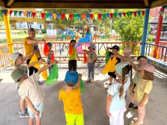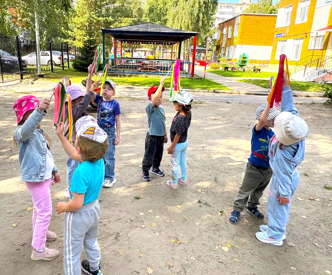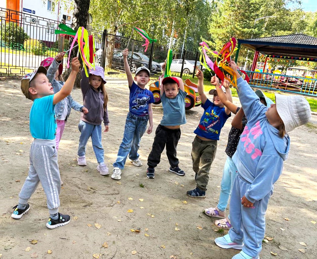 Летние прогулки – это возможность играть и заниматься на свежем воздухе. Воспитанники средних групп отрабатывали плавность и изящество танцевальных движений, используя яркие, разноцветные платочки и султанчики.