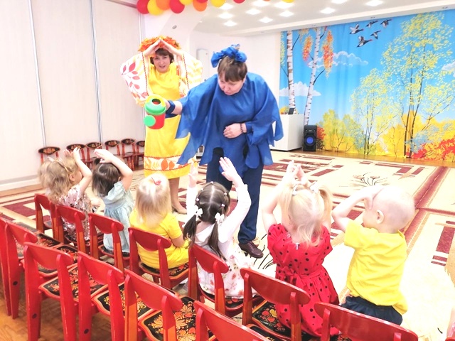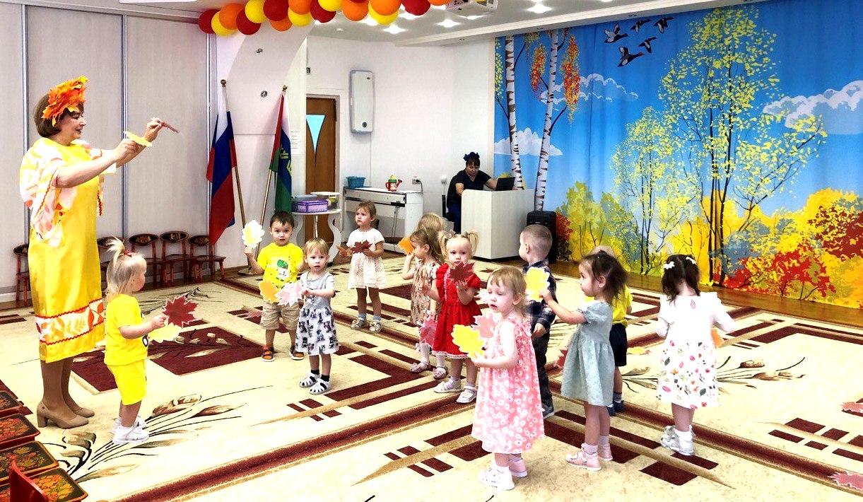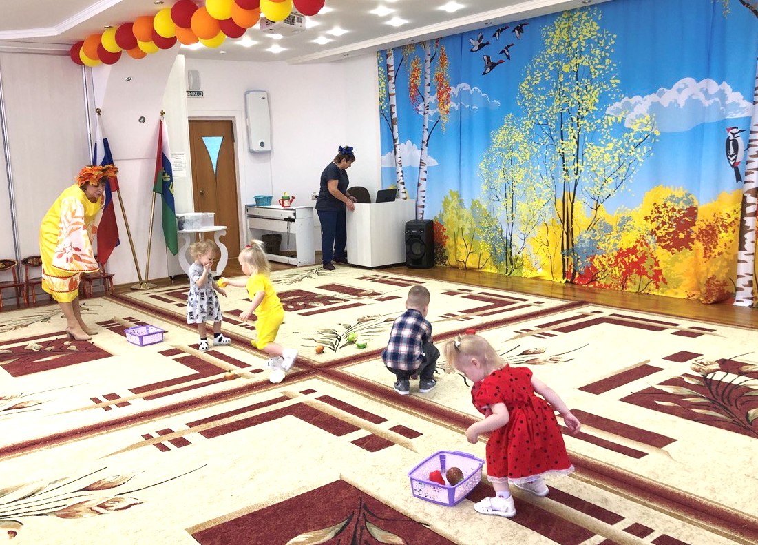 Малыши танцевали с разноцветными листочками, играли в весёлые игры: собирали фрукты, овощи и грибы, соревновались в ловкости и внимательности. В зале царила атмосфера радости, смеха и ярких эмоций.