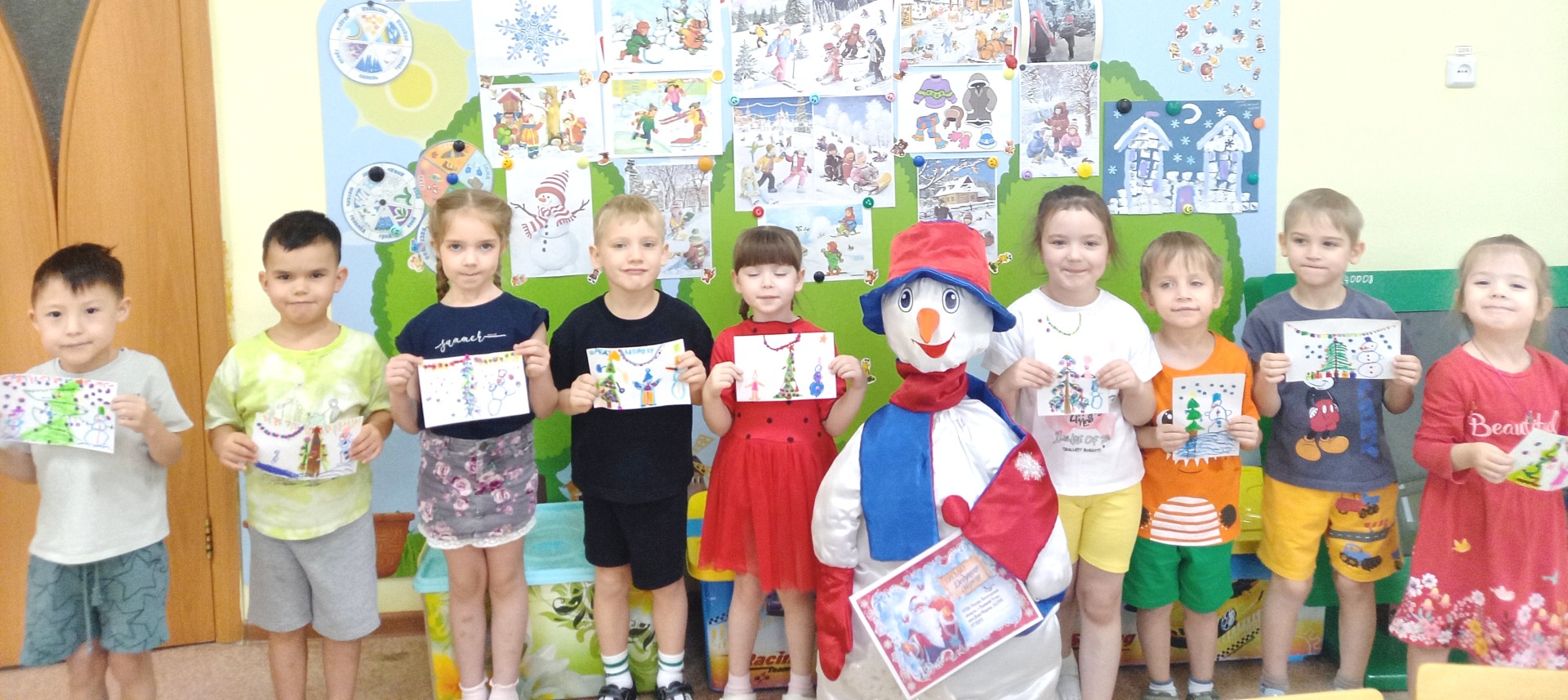 Вдохновлённые зимней сказкой, дети решили с помощью рисунков сообщить дедушке, что им нужна пушистая ёлочка, ведь без неё праздник не будет таким волшебным, а весёлый снеговик с радостью согласился помочь ребятам.