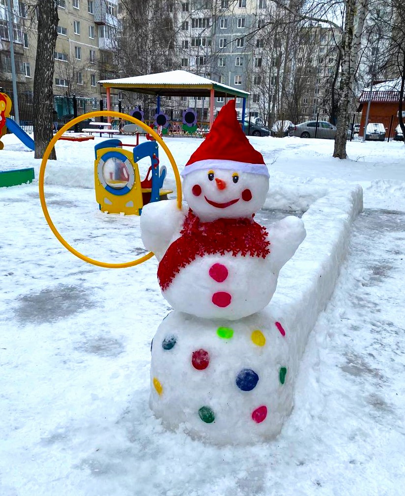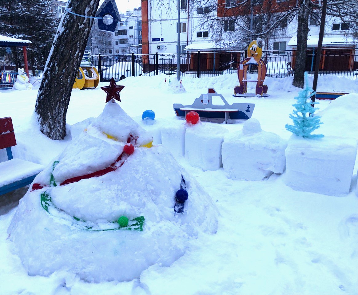 Благодаря вдохновению и добрым рукам взрослых, появились волшебные сюжеты: яркие сказочные персонажи, уютные уголки для весёлых игр, нарядные ёлочки, активности для развития ловкости и физических качеств, а забавные фигуры снеговиков радуют глаз и поднимают всем настроение.