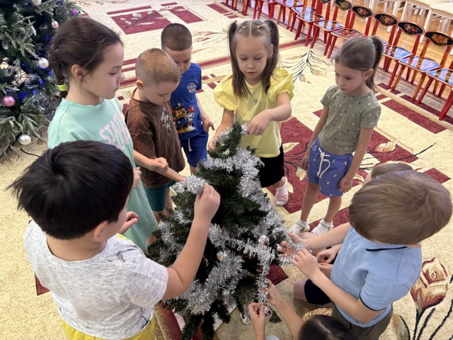 Дети нарядили небольшую праздничную ёлочку новогодними шарами и блестящей мишурой, с удовольствием водили дружный хоровод вокруг зелёной красавицы, напевая любимые новогодние песенки.