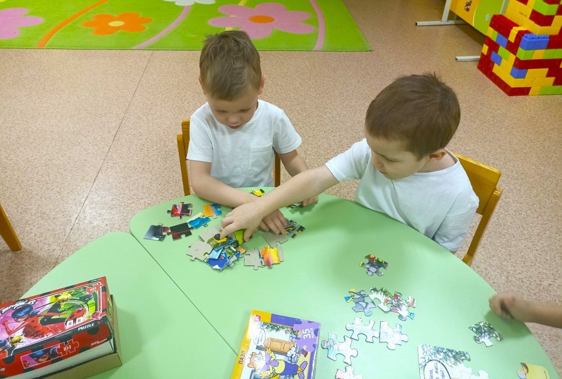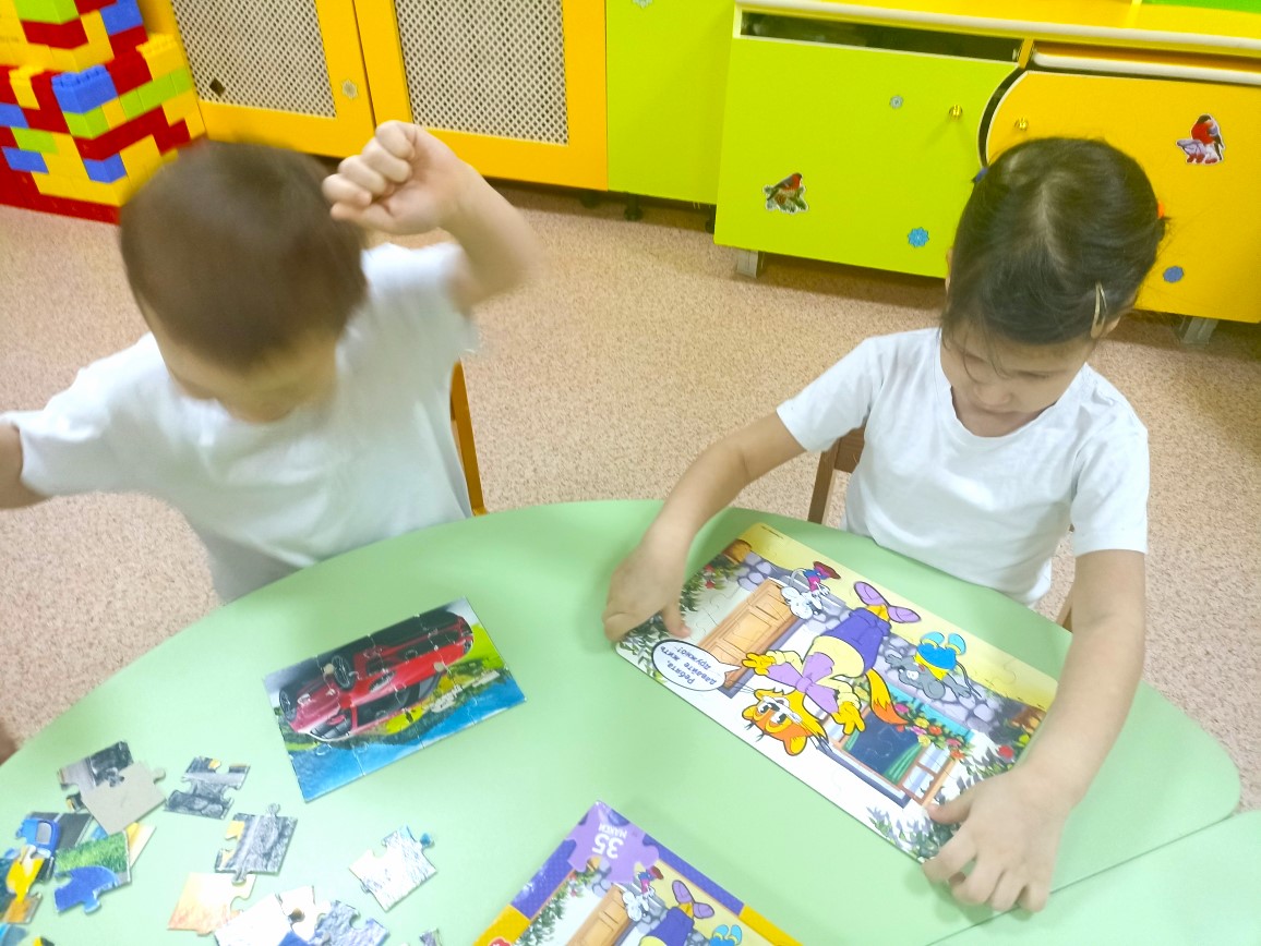 В старшей группе «Колокольчик», есть много разных пазлов на любую тему: предметный мир, сказки и природа. Ребята готовы их собирать в любую свободную минуту, в любое время года, утром и вечером. Собирание пазлов – это увлекательное занятие, которое способствует развитию различных навыков и способностей у детей: развивает мелкую моторику рук, помогает различать детали по цвету, форме, воспринимать связь между общим и целым, помогает развивать социальные навыки. Когда дети собирают пазлы вместе с другими детьми или с воспитателем, родителями, они учатся сотрудничать, обмениваться и общаться. Это развивает у них навыки коммуникации и способность работать в команде.