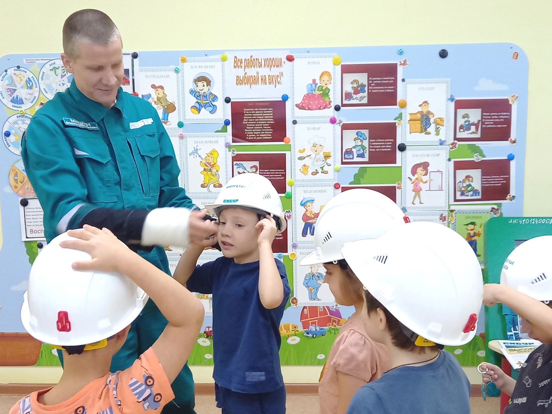 Первой встречей была с Мишиным Владимиром Михайловичем, он рассказал, что работает в самой крупной компании нашего города -СИБУР, директором по капитальному строительству. Объяснил детям, что важно планировать работу и работать в команде, чтобы создавать современные и экологичные материалы и технологии, заботясь о природе и будущем планеты. Познакомил ребят с полипропиленом, а они сравнили его с разноцветным бисером, и очень удивились когда узнали, что из него производят: тару и упаковку, трубы, изделия для медицинской отрасли и др. В процессе беседы Владимир Михайлович предлагал детям примерить строительные каски, рассказал, что у работников СИБУР специальная одежда. Подарил малышам на память о встрече: брелки-изготовленные на заводе, познавательные книги, наклейки с портретом Д.И Менделеева.
