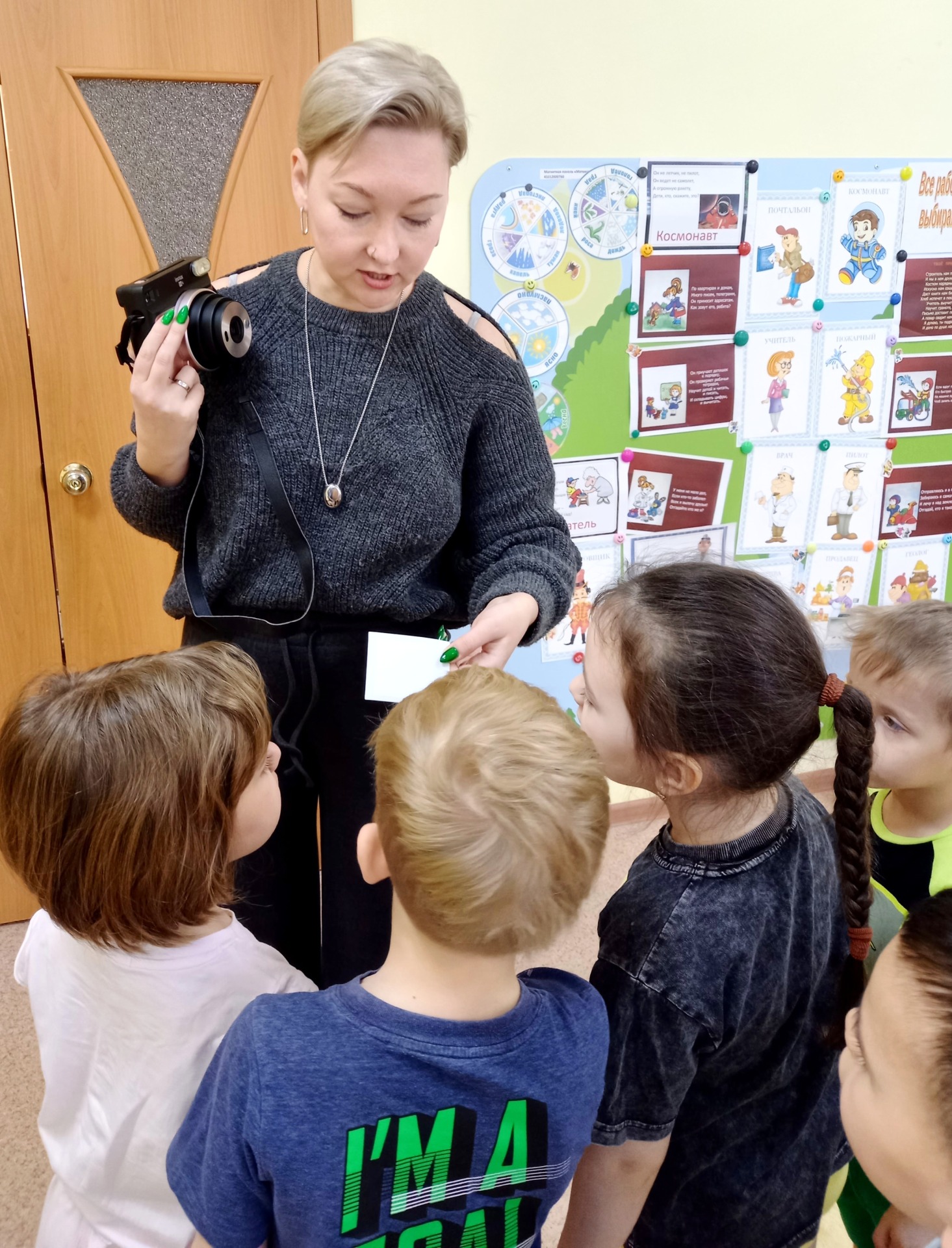 С удивительной профессией - фотограф, нас познакомила Пехливанлы-Серебрянская Яна Юрьевна. Она показала детям разные камеры-от маленьких карманных до больших профессиональных, и все они были красивые и интересные. Ребята с замирающим сердцем рассматривали эти приборы, а Яна Юрьевна объяснила, что каждая камера - как волшебная машина, которая превращает свет и тень в удивительные картинки. Детей поразили очки с камерой, это было для них сказочным моментом -волшебством.Наш очаровательный фотограф на какой-то момент превращалась в волшебника, и фотографировала ребят то с помощью очков, то с фотоаппарата который выпускал тут же белый лист, который постепенно "превращался в фотографию. Встреча была удивительно волшебной.