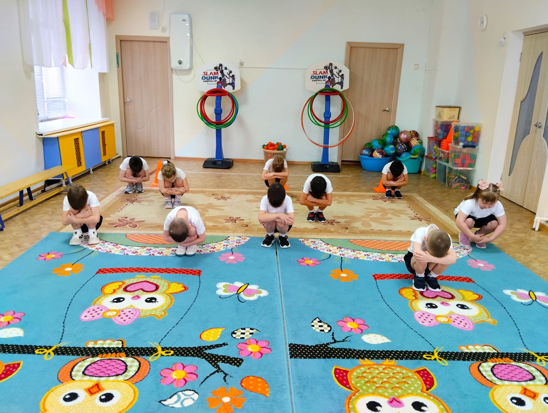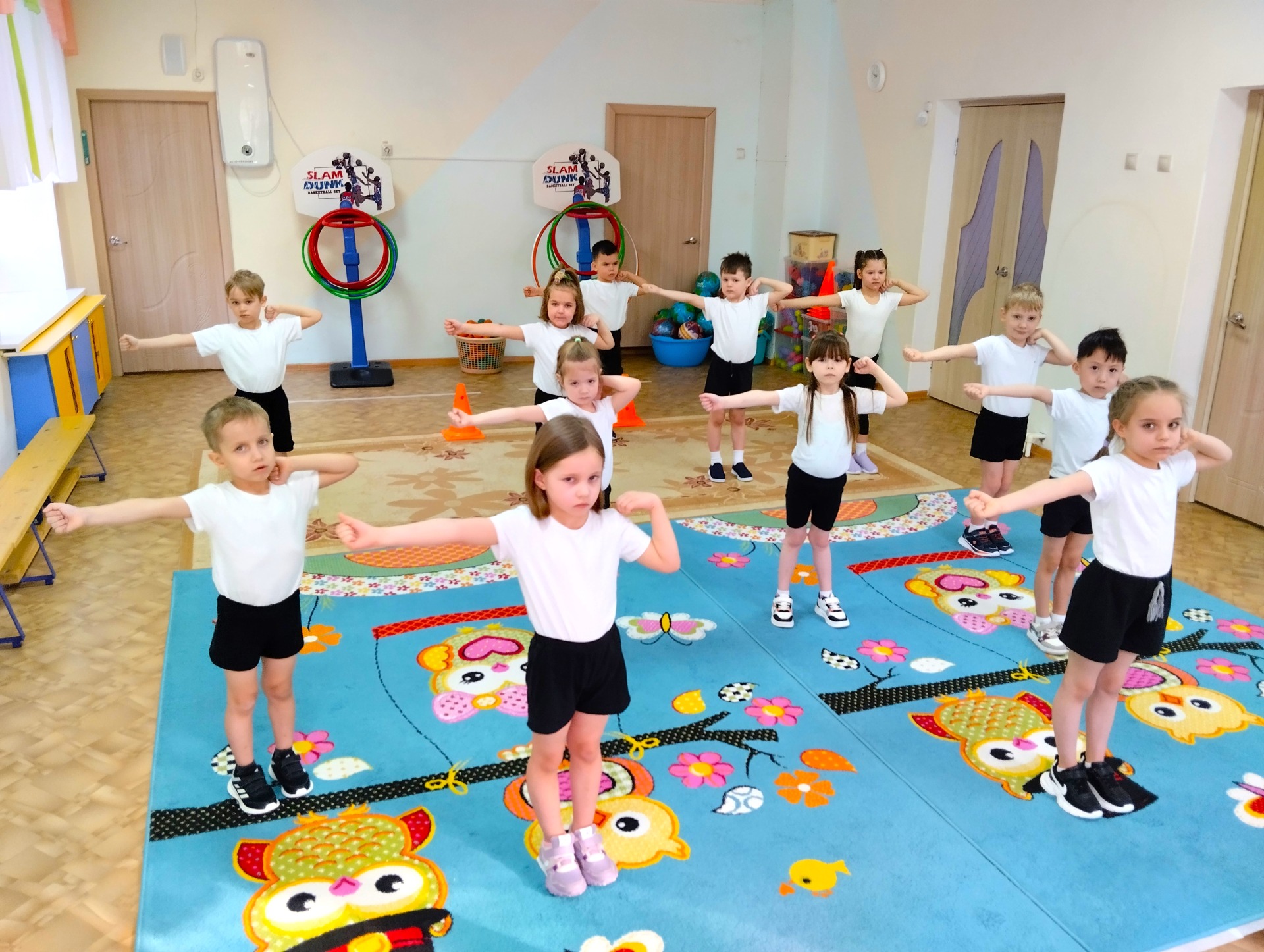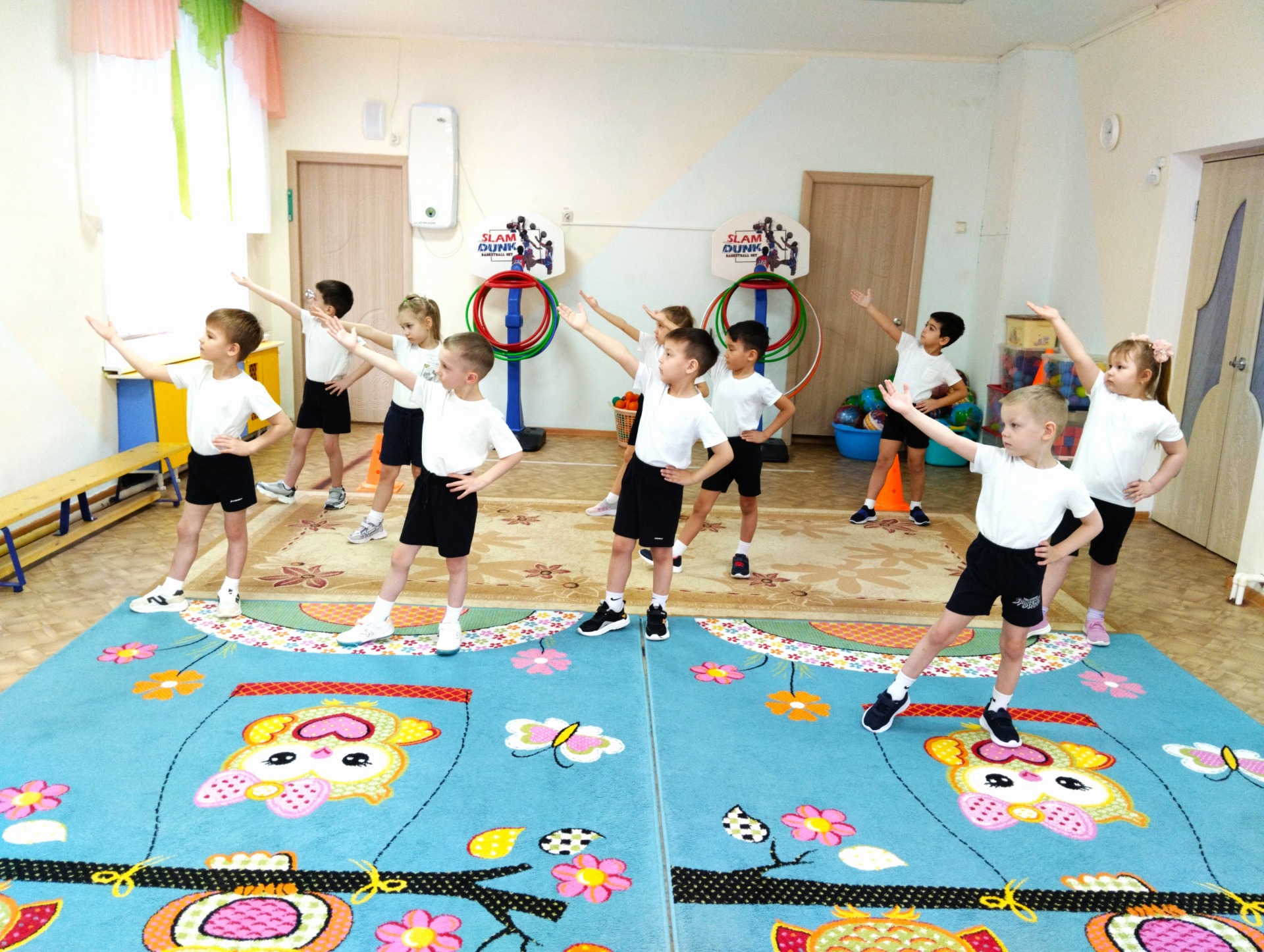 С учетом этого в содержание занятий ритмической гимнастикой для дошкольников включаются: ритмические движения в сочетании с полуприседаниями, приставными шагами, выразительными движениями рук. Небольшие волнообразные движения туловищем дополняют упражнения, превращая их в своеобразный спортивный танец.