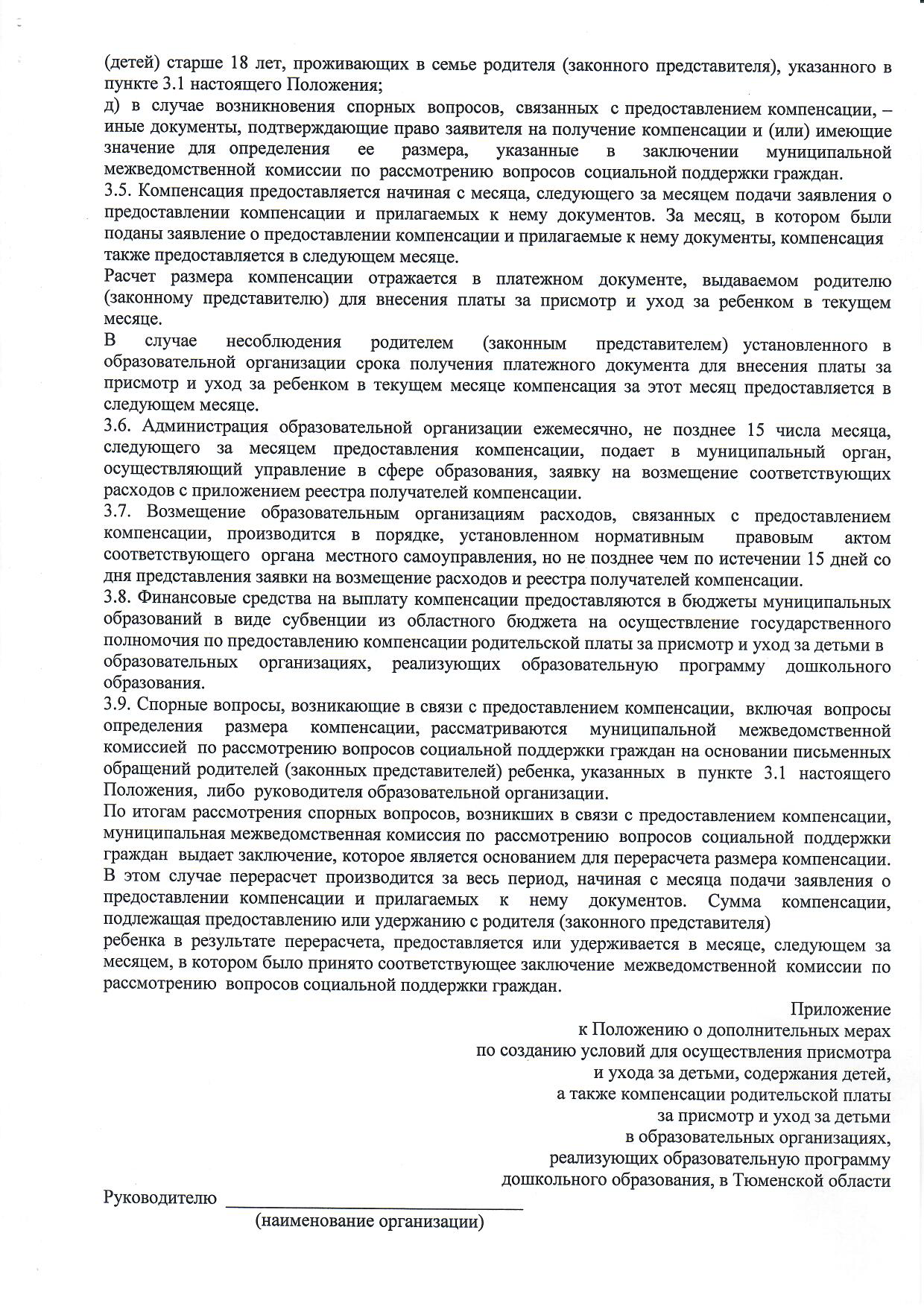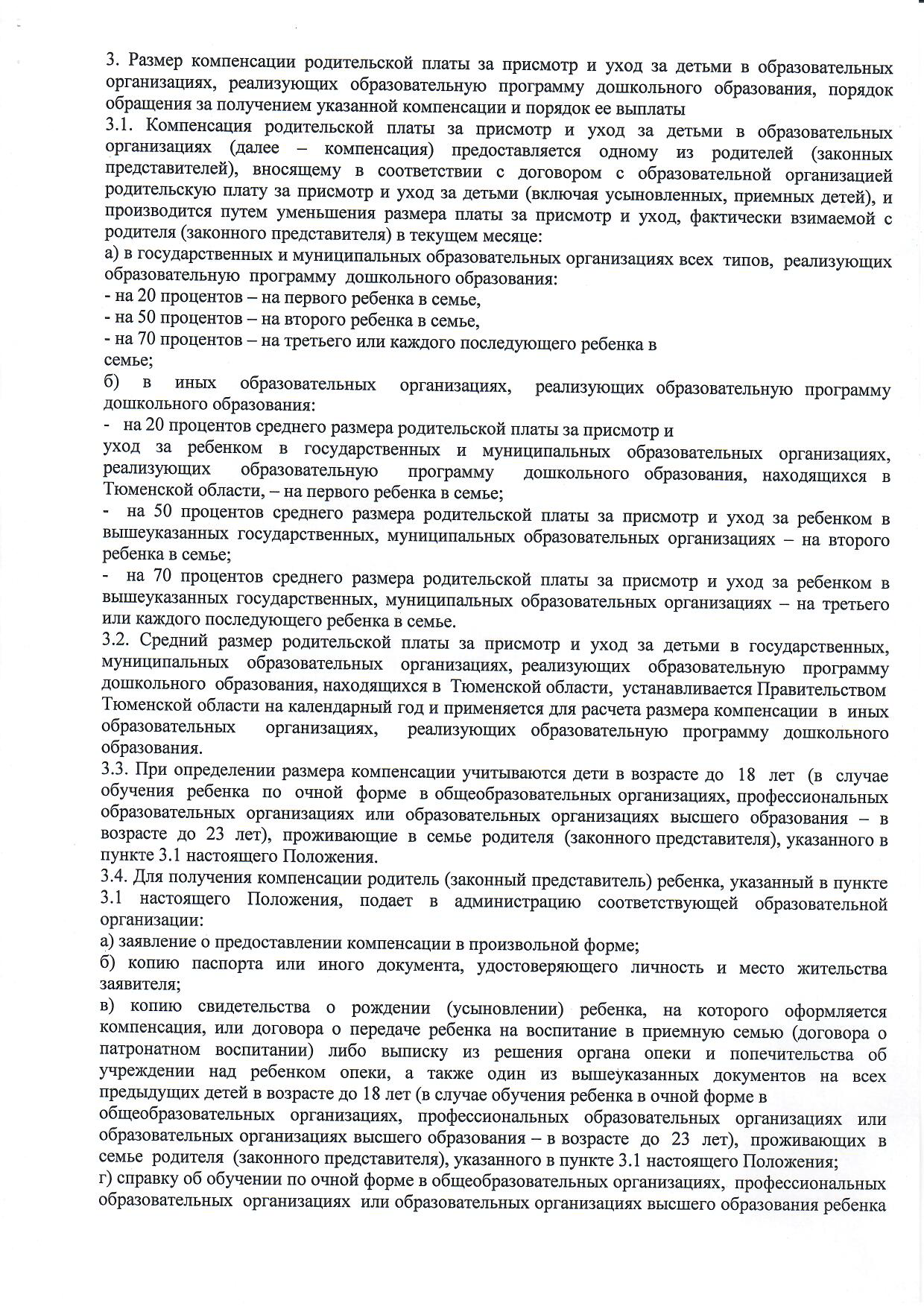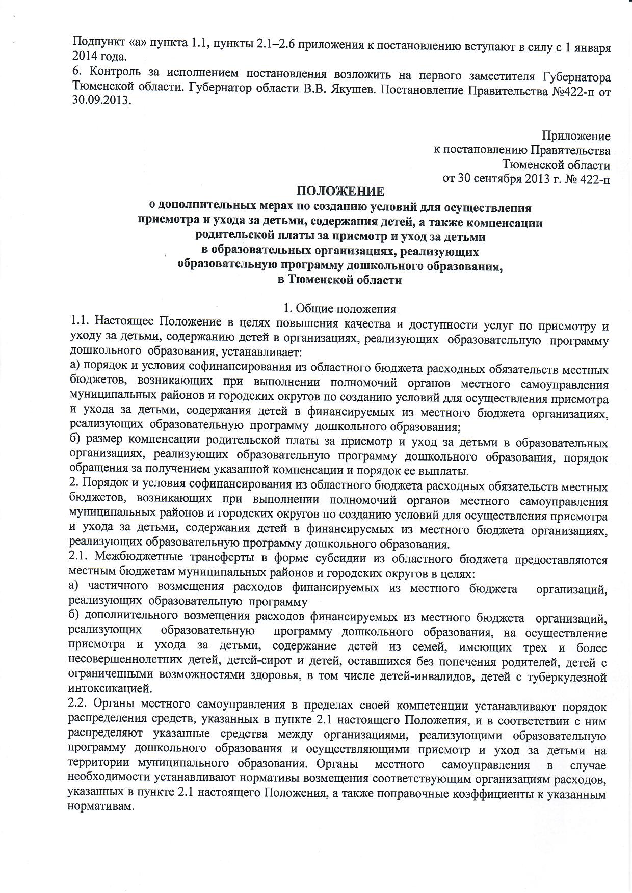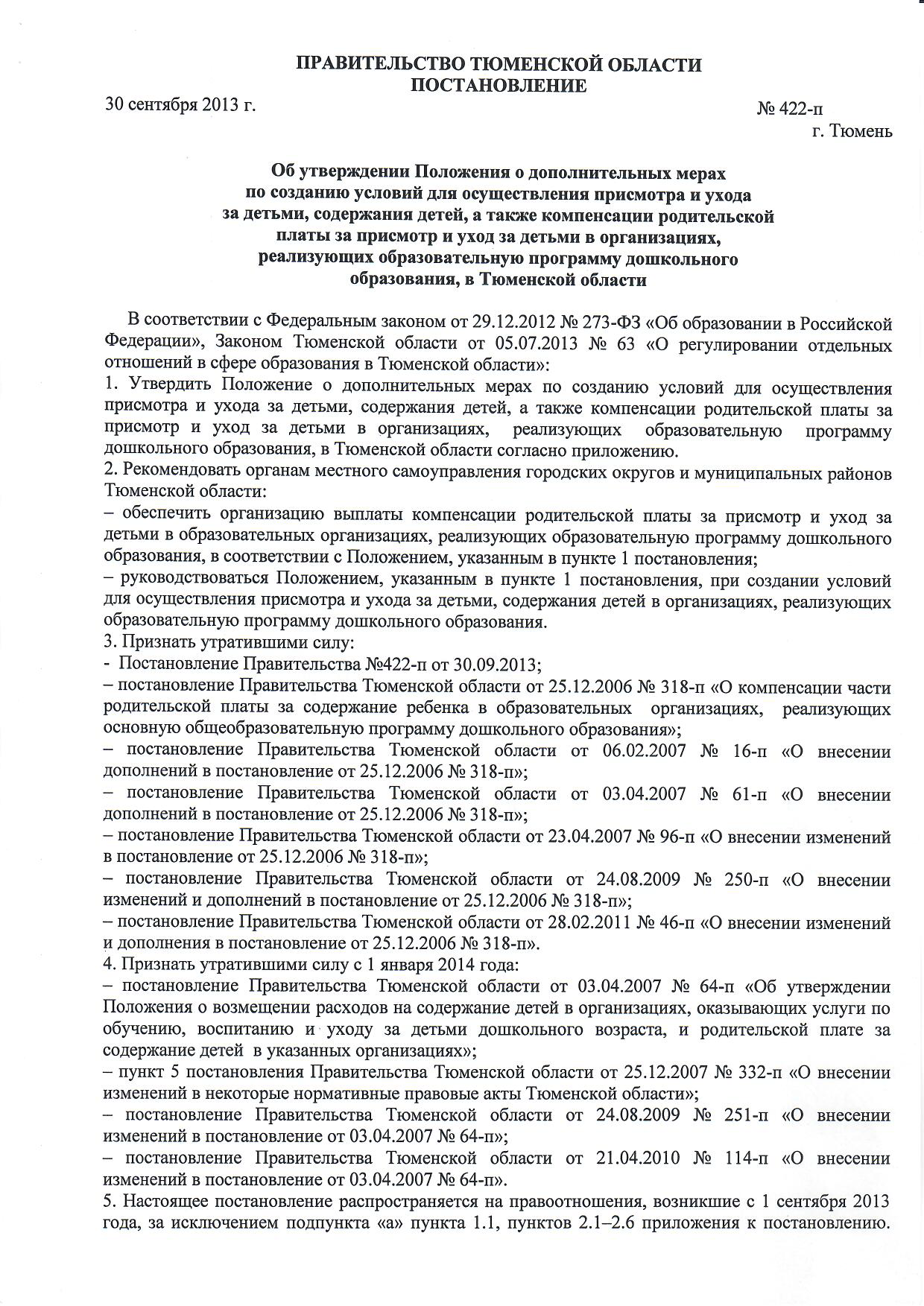 Постановление об утверждении Положения о дополнительных мерах по созданию условий для осуществления присмотра и ухода за детьми, содержания детей, а также компенсации родительской платы за присомтр и уход за детьми в организациях, реализующих программу дошкольного образования, в Тюменской области